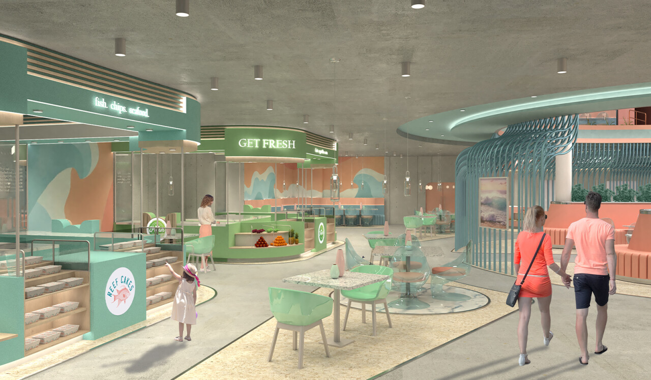 The design concept is derived from the waves flowing around and over the rocks along the Seafront Promenade. This idea of linear and curved forms explored are used throughout the complex to form links between the vast range of facilities distributed across, creating contemporary spaces that brings an experiential journey for users, transforming this coastal town for an exciting future built environment.