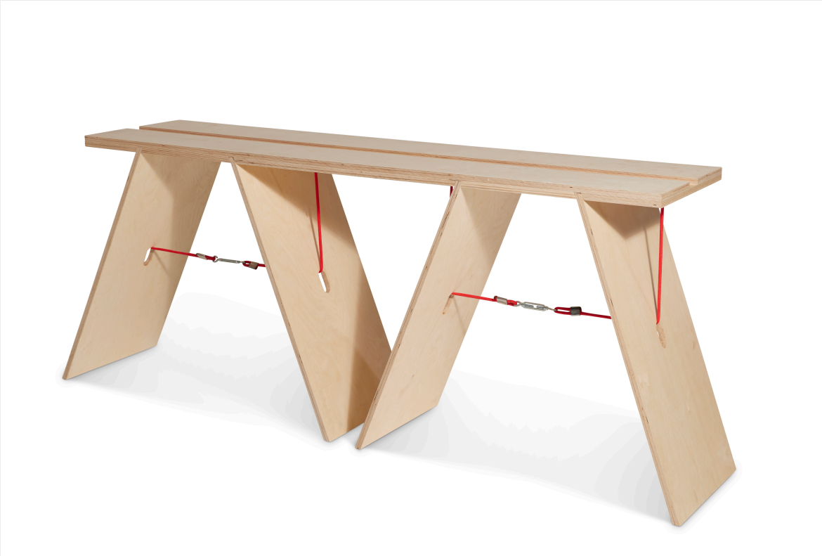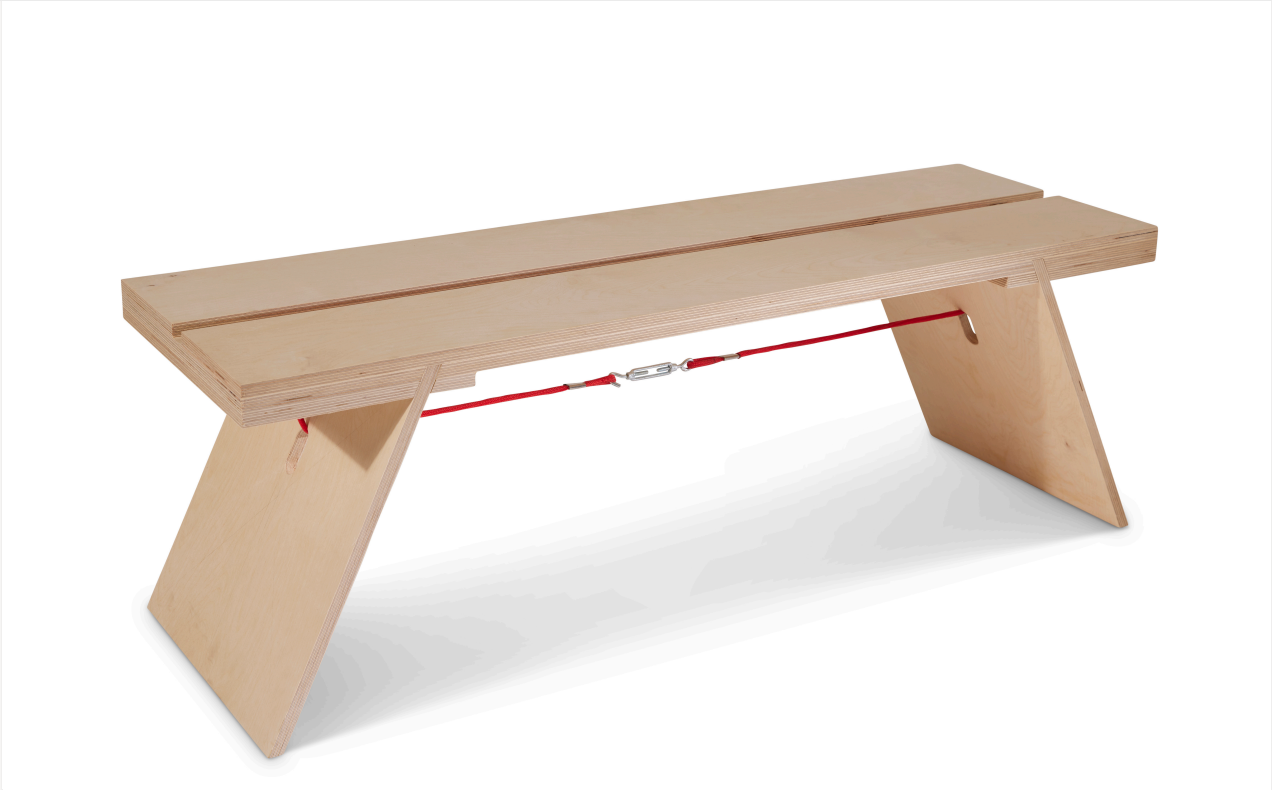 The tension bench has been designed to be a two person bench for interior use. The two legs of the bench can be slotted into position without the need for glue, screws, nails or any joinery. The bench is held together by weight and the addition of tension. A rope runs over the top of the furniture and looping through the legs of the bench, using the tensioner mechanism found underneath the user can tighten the bench twisting the mechanism clockwise. Using tension the piece of furniture becomes solid. With the straight forward instruction the bench can be assembled and taken apart in minutes.