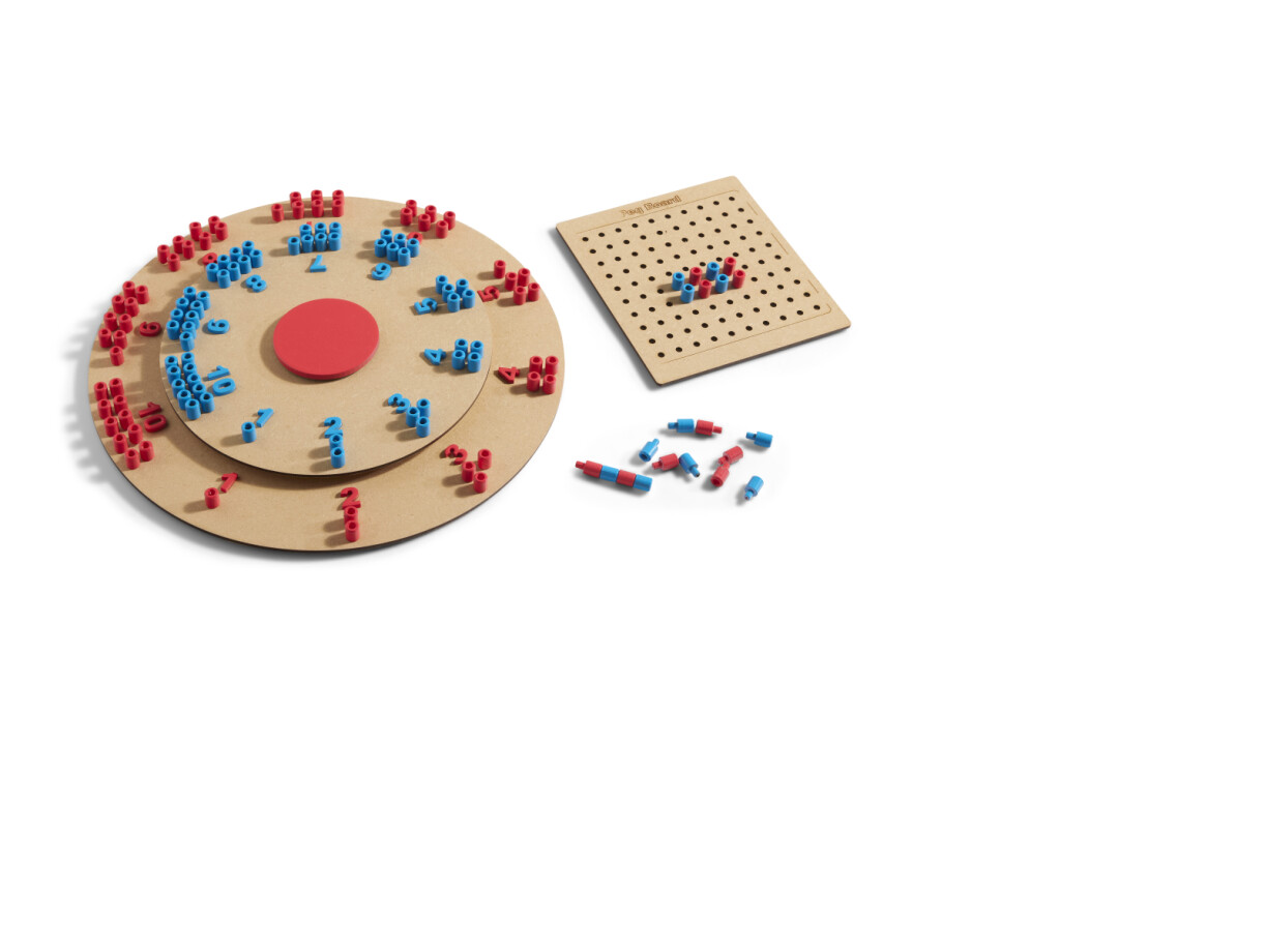 The teacher chooses an exercises and set the board in front of the children with the exercises accompanying tools. They explain the objective, in this case addition. The user or users, spin the two disks. The numbers which line up directly in front of each user is the equation. The user then solves the equation they have created either with pen, fingers, pegs and pegboard or other resources.