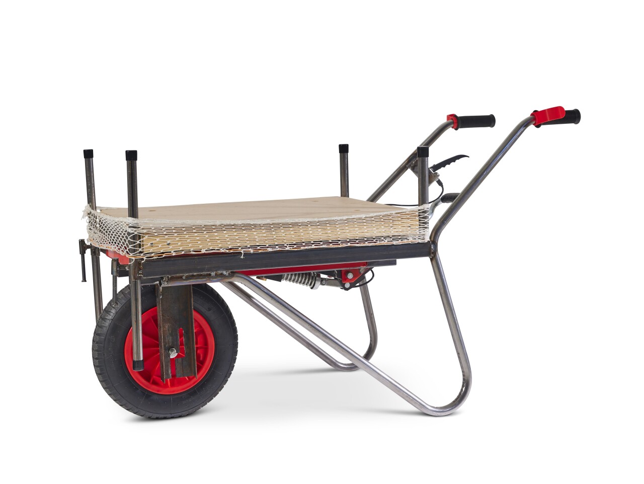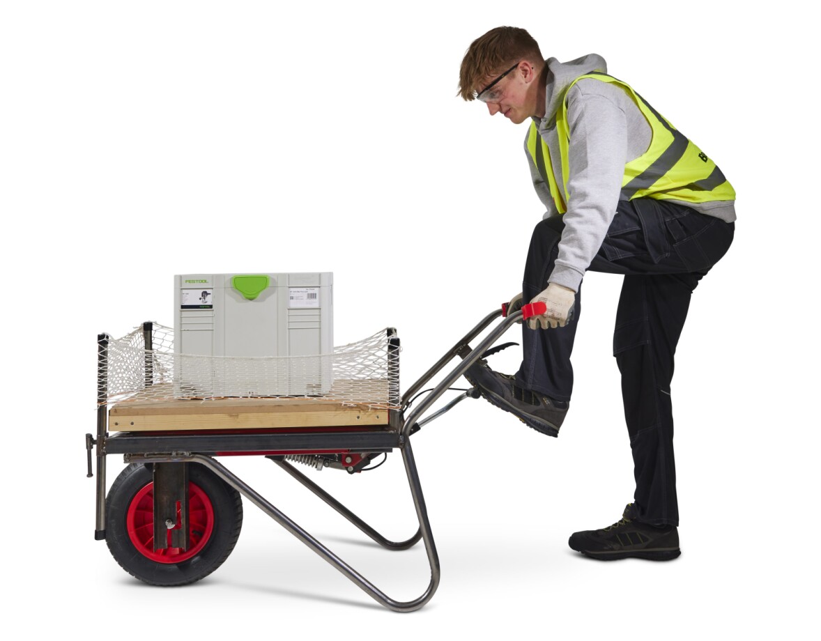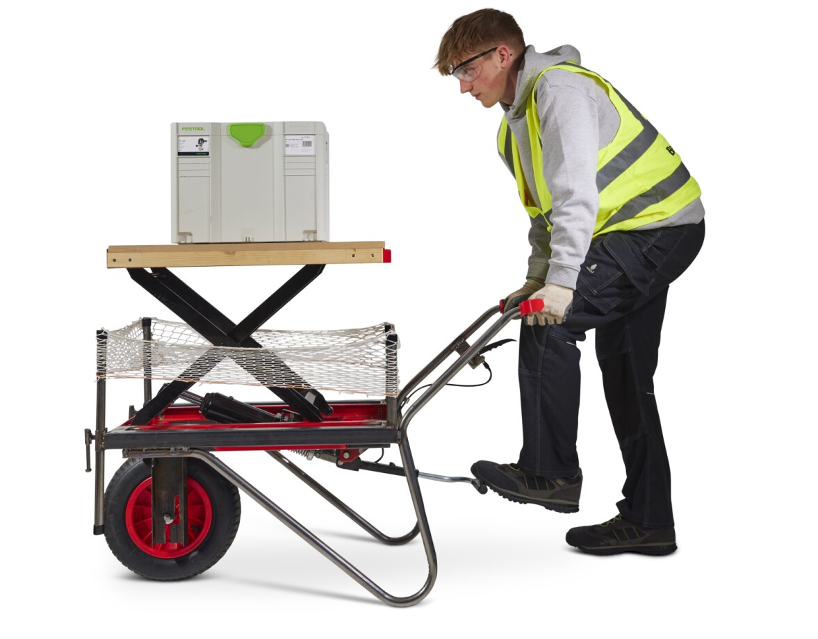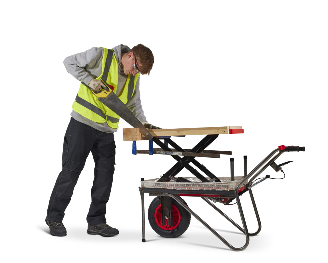 To load the WorkWagon the user can simply push the equipment out of the van and onto the WorkWagon which can be set at the same height as the floor of the van. The user will then put a netting around the Workbench to prevent the equipment from falling off whilst in transit. The WorkWagon can then be easily pushed to the desired location on site. It’s narrow width (550mm) allows the Work Wagon to navigate constrained spaces, whilst the single wheel design increases its manoeuvrability. The workbench can then be raised using the foot pump, and the support legs can be dropped for added stability. When the workbench is in use, the user can clamp or secure material to it through the 20mm holes or by the clamping points on the side of the workbench.