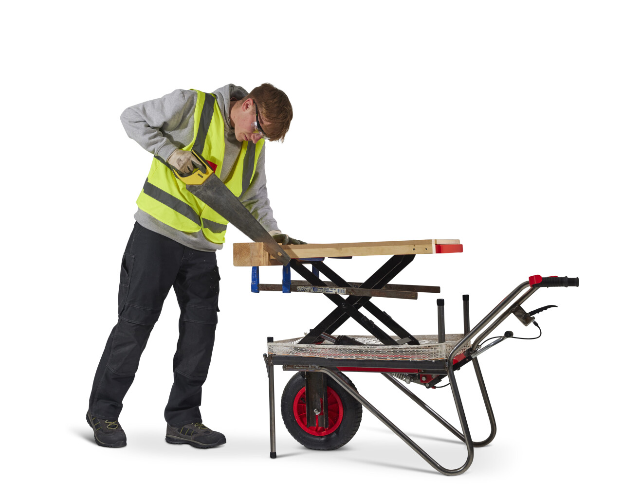 The problem area for the WorkWagon was identified through interviews, first hand experiences, benchmarking, and photo studies. It was shown that tradespeople injury themselves unnecessarily when lifting heavy weights and twisting while carrying the weight. The focus of the product was narrowed down to aiding the user to unload and load a van safely, without getting injured unnecessarily. The WorkWagon is a product that combines a wheelbarrow and a portable workbench to become the ultimate tradesperson’s tool. The WorkWagon can transport anything that weighs 150kg or less, to and from vans to the required working location. Once the WorkWagon is at a suitable location to work from on the site, it doubles up as a workbench that can be raised to the optimum working height (850mm).