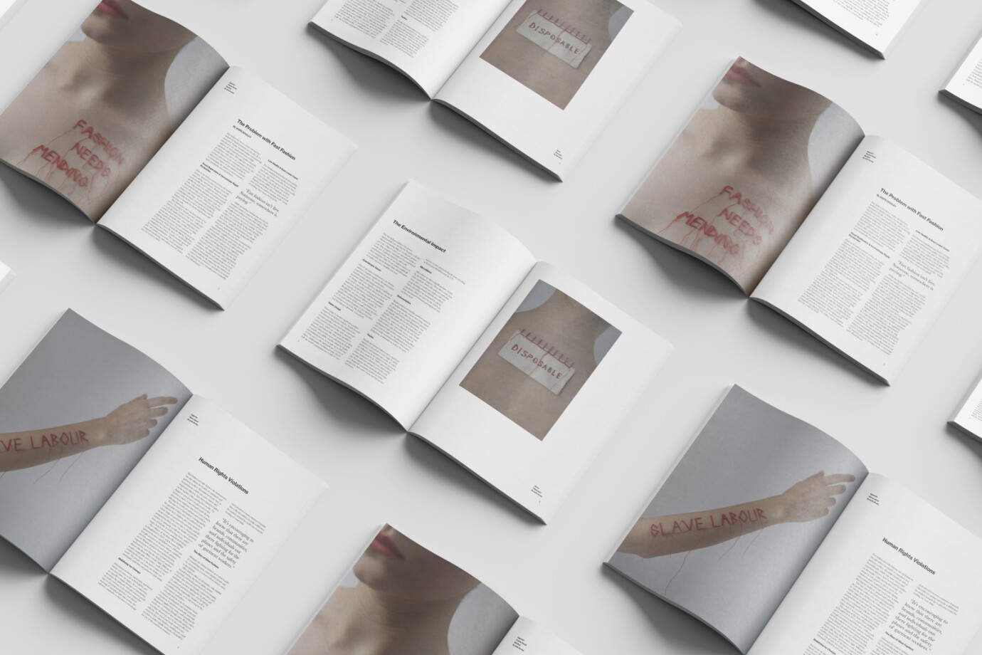 I designed these spreads in response to an editorial design brief and published the images during #fashionrevolutionweek to help raise awareness of exploitation within the fashion industry. Most of our clothes are made in places where working conditions are often inhumane and the workers rights are limited. These images aim to visually represent how our clothing choices can have a direct impact on other human beings’ lives.