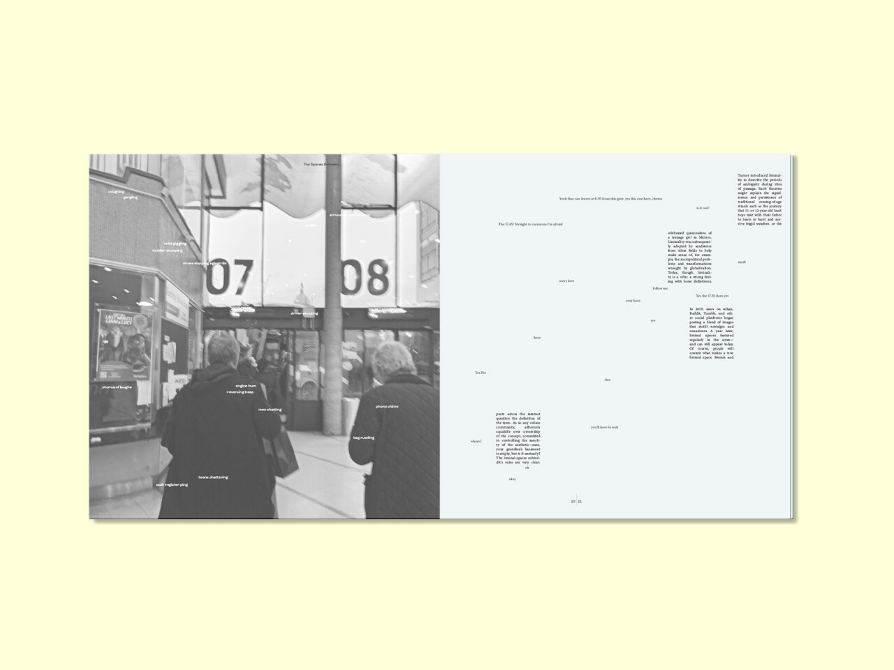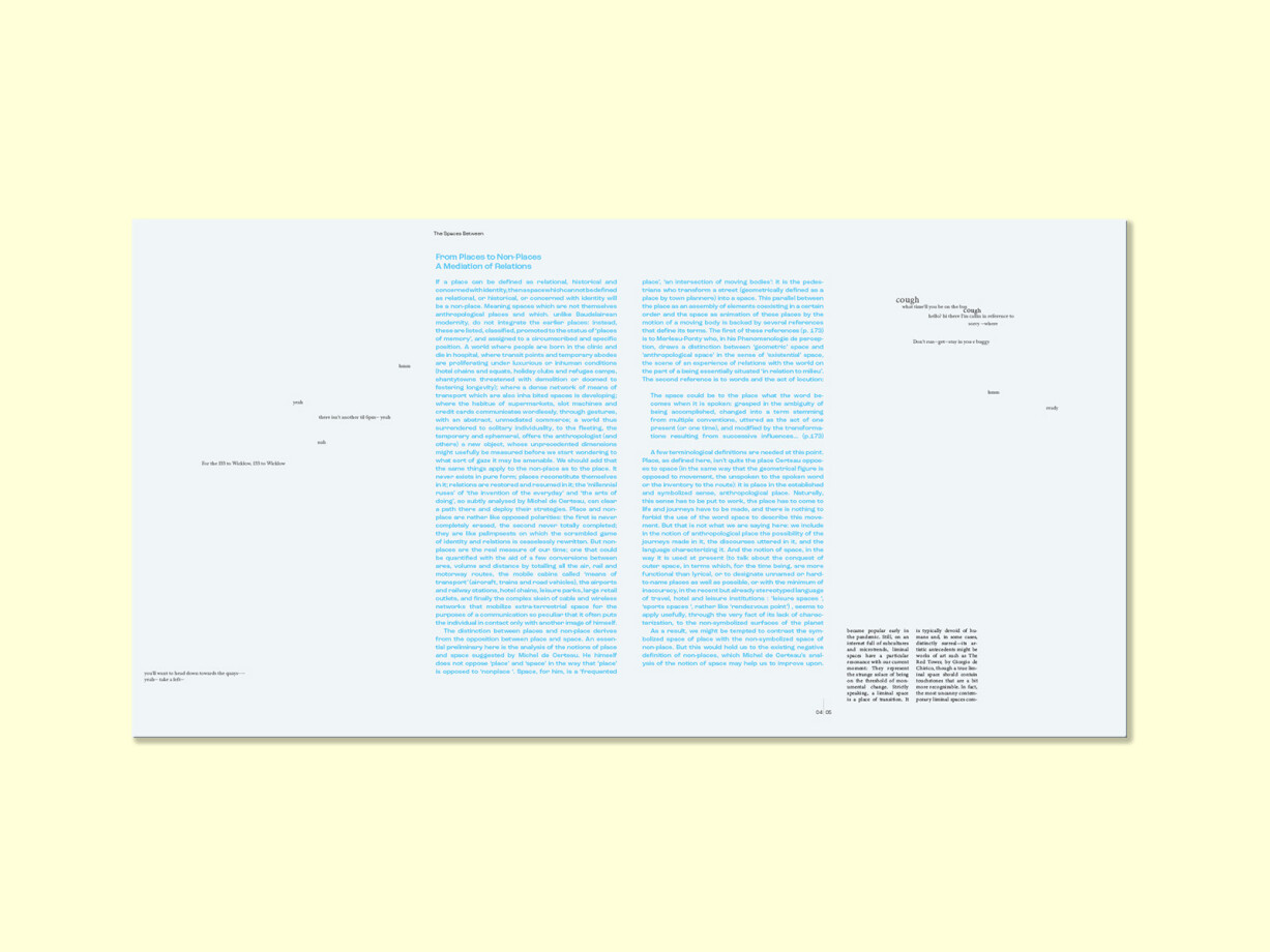 Taking on the ISTD Student brief of The Spaces Between with a focus on the individual experience of a liminal space, this publication takes the reader into the daily routine of traversing Busarás bus station in Dublin. Utilizing the text Non-Places: An Introduction to Supermodernity by Marc Augé alongside secondary texts on liminality from The Atlantic and The New Yorker, as well as personally transcribed audio scripts from within Busarás over the winter of 2022, this publication invites the audience to consciously take in the spaces we mindlessly cross through. By grounding oneself in the moment we open our eyes to spaces never seen before.