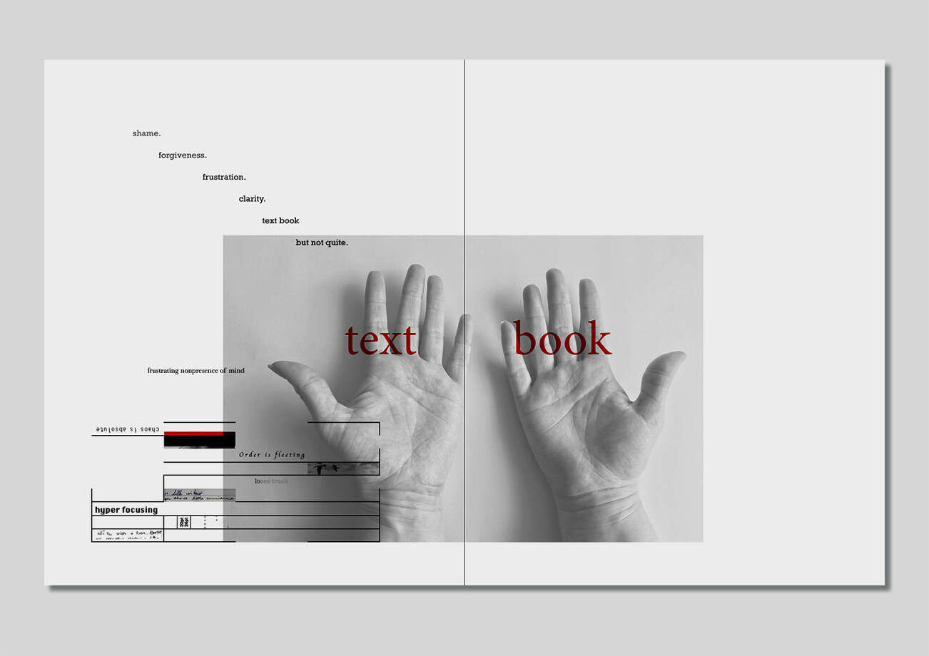 This project is a response to ISTD brief, The Space Between. I observe the connection between education system, ADHD, and trade industry. Designed with intentional confusion, this three-part publication echoes the experience of making sense of oneself and their space in the world, while querying adult ADHD. Within the space between teenage years and societies expectation of adulthood, there are pinnacles of growth that never seem to come into fruition. Everyday tasks and responsibilities become uncompleted goals. Left unchecked, this plays into the never-ending cycle of low self-esteem and self-deprecation.