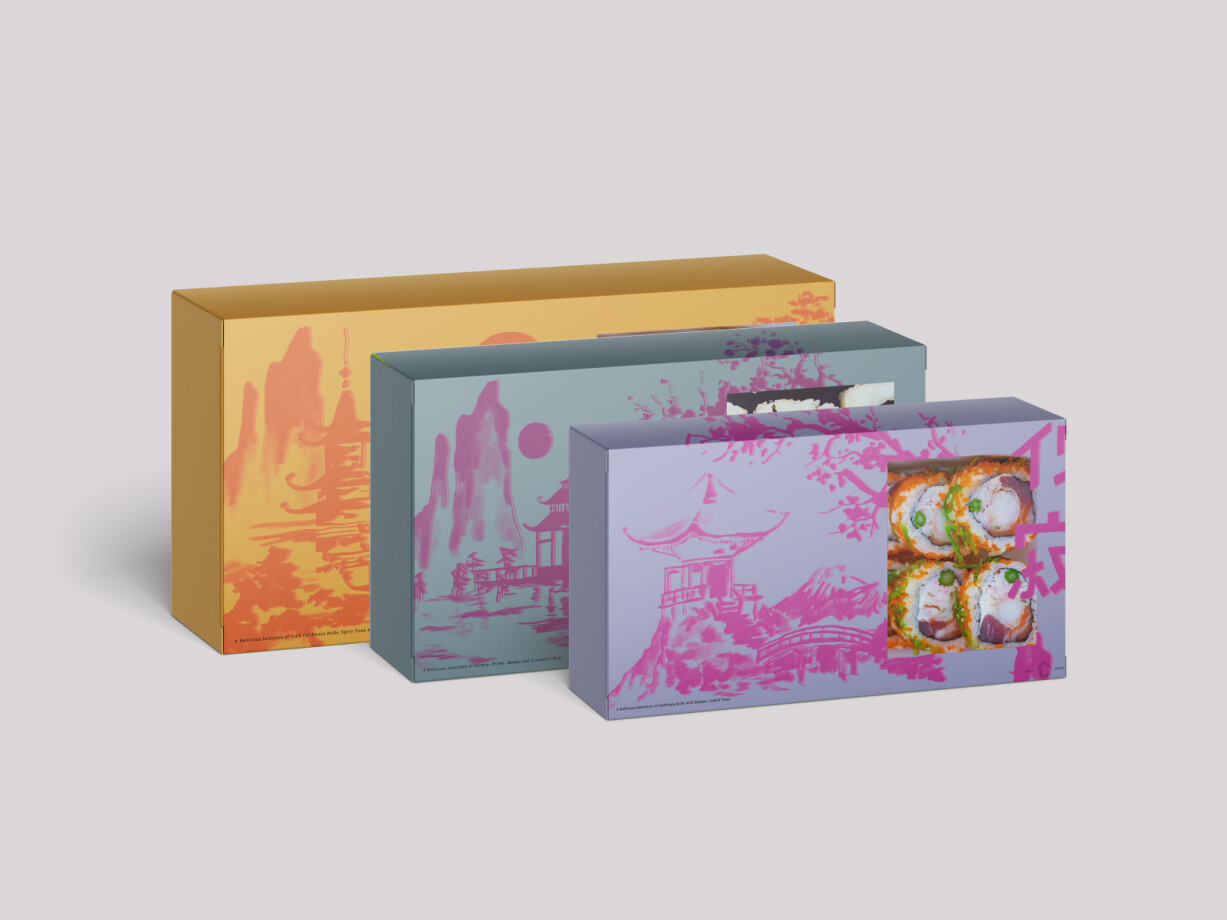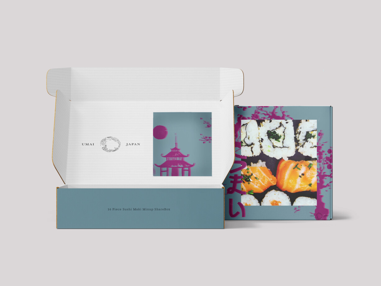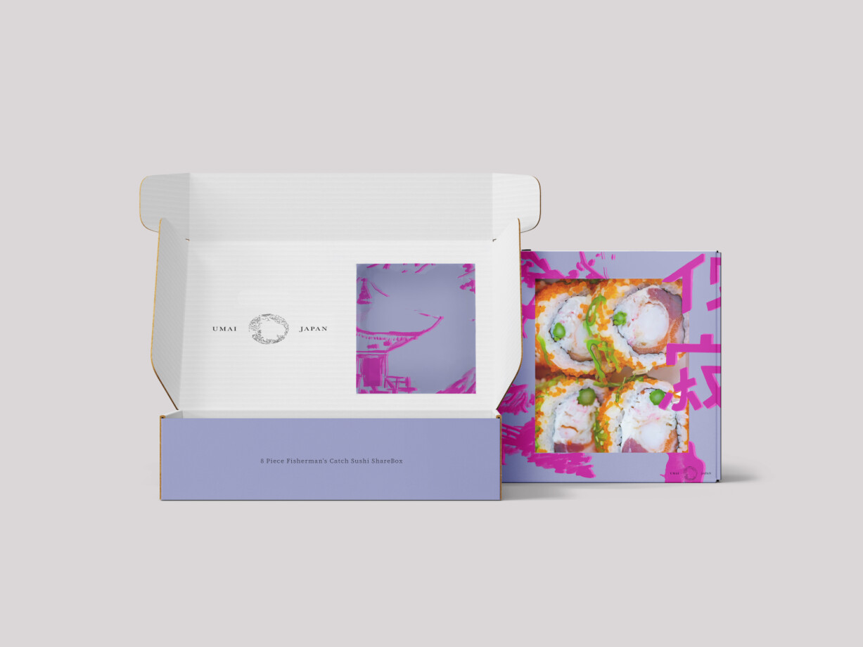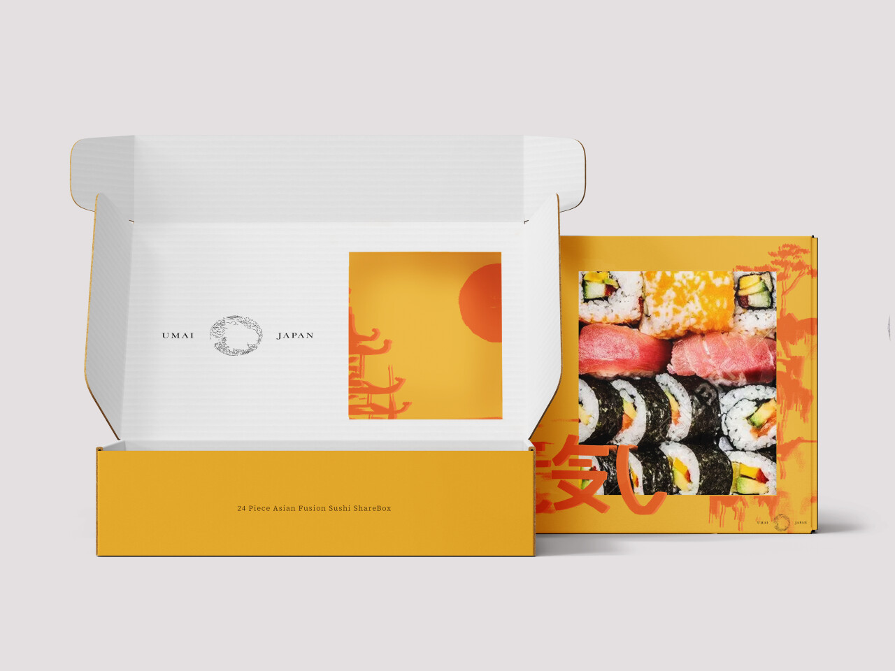 Umai Japan is an affordable, eco-friendly brand that sells sushi share boxes. This brand was inspired by M&S sushi but eliminates all single-use plastics and features fun colours and exciting designs. The brand is called Umai Japan, ‘Umai’ meaning yummy in Japanese. I wanted the packaging and branding to be Japanese inspired and feature Japanese paintings and patterns but with a modern twist. I devised my own logo made from an ornate Japanese pattern that appears inside and on the front of the boxes. The brand contains three different size boxes that can be shared with friends or colleagues. One is an 8-piece box, one is a16-piece box and the other is a 24-piece box.