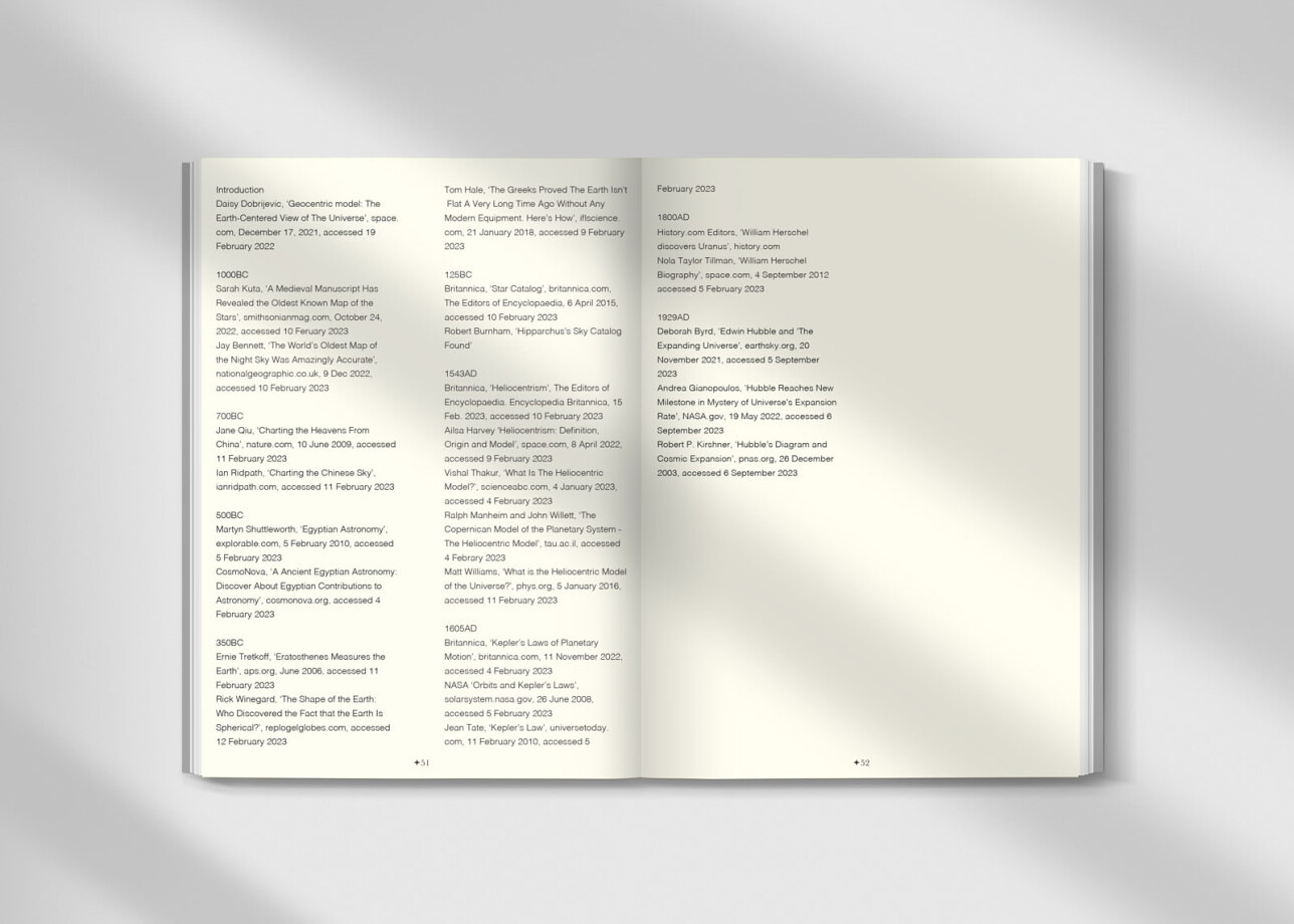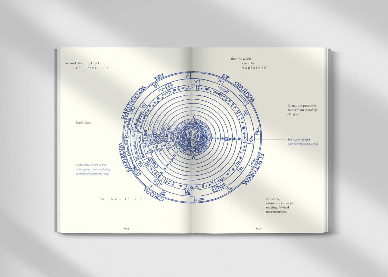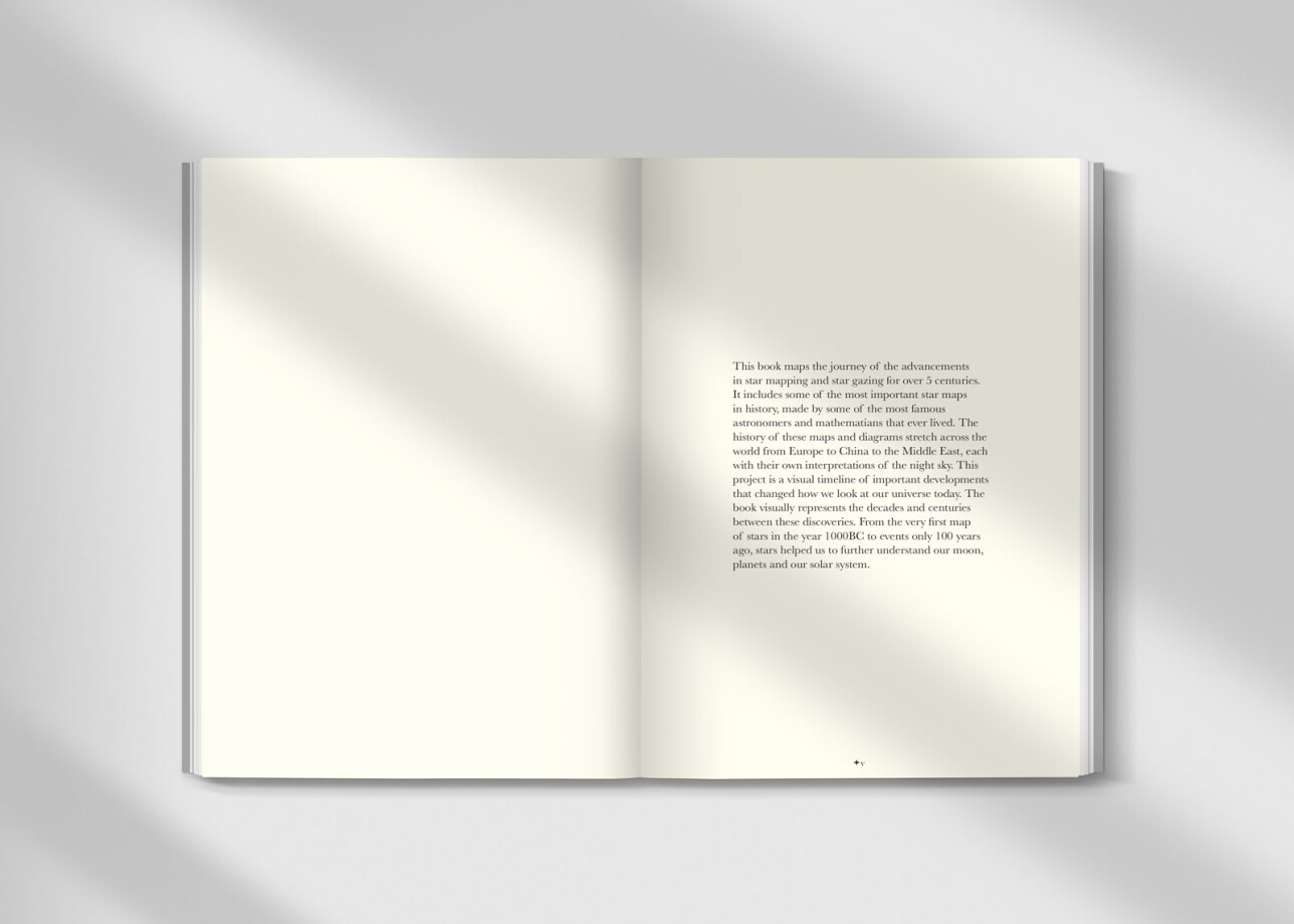 This book maps the journey of the advancements in star mapping and star gazing for over 5 centuries. It includes some of the most important star maps in history, made by some of the most famous astronomers and mathematicians that ever lived. The history of these maps and diagrams that stretch across the world from Europe to China to the Middle East, each with their own interpretations of the night sky. This project is a visual timeline of important developments that changed how we look at our universe today. The book visually represents the decades and centuries between these discoveries. From the very first map of stars in the year 1000BC to events only 100 years ago, stars helped us to further understand our moon, planets and our solar system.