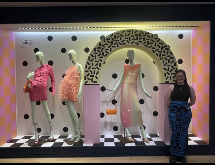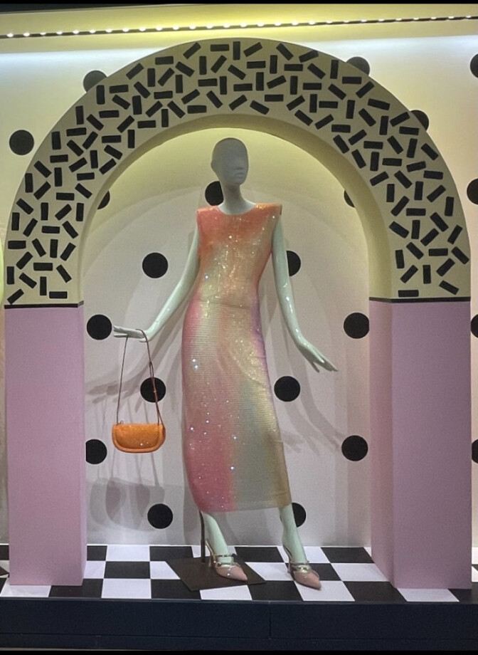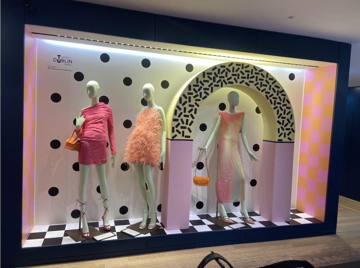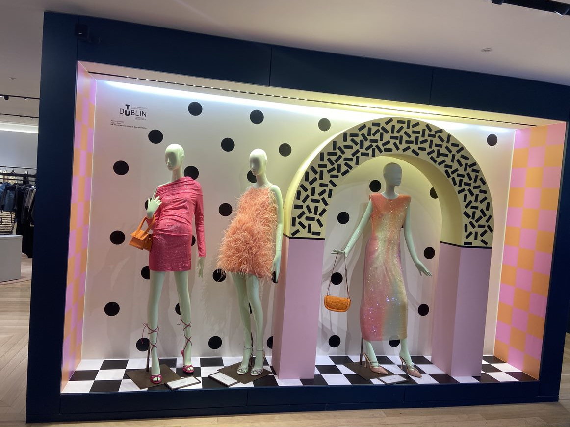 My display is inspired by the WGSN trend Full Spectrum which features offbeat designs and bold patterns. Contrasting elements are a recurring theme in this trend, and they are combined in fun and spontaneous ways. As I dived into this trend I found a sub-trend that really captured my fun personality and love for colour. Polka dots and checks are given a maximalist overhaul in supersized proportions and bright accents in this sub-trend which inspired my design as it transports you into this explosion of polka dots and checkerboard prints almost playing an homage to the Memphis art movement as it has a similar style. In order to contrast this I styled my mannequins in fun and exciting party wear looks, They stood out amongst all the patterns going on in my display and also complimented it really well. The hope I have for my design is that it brings joy to those that see it.