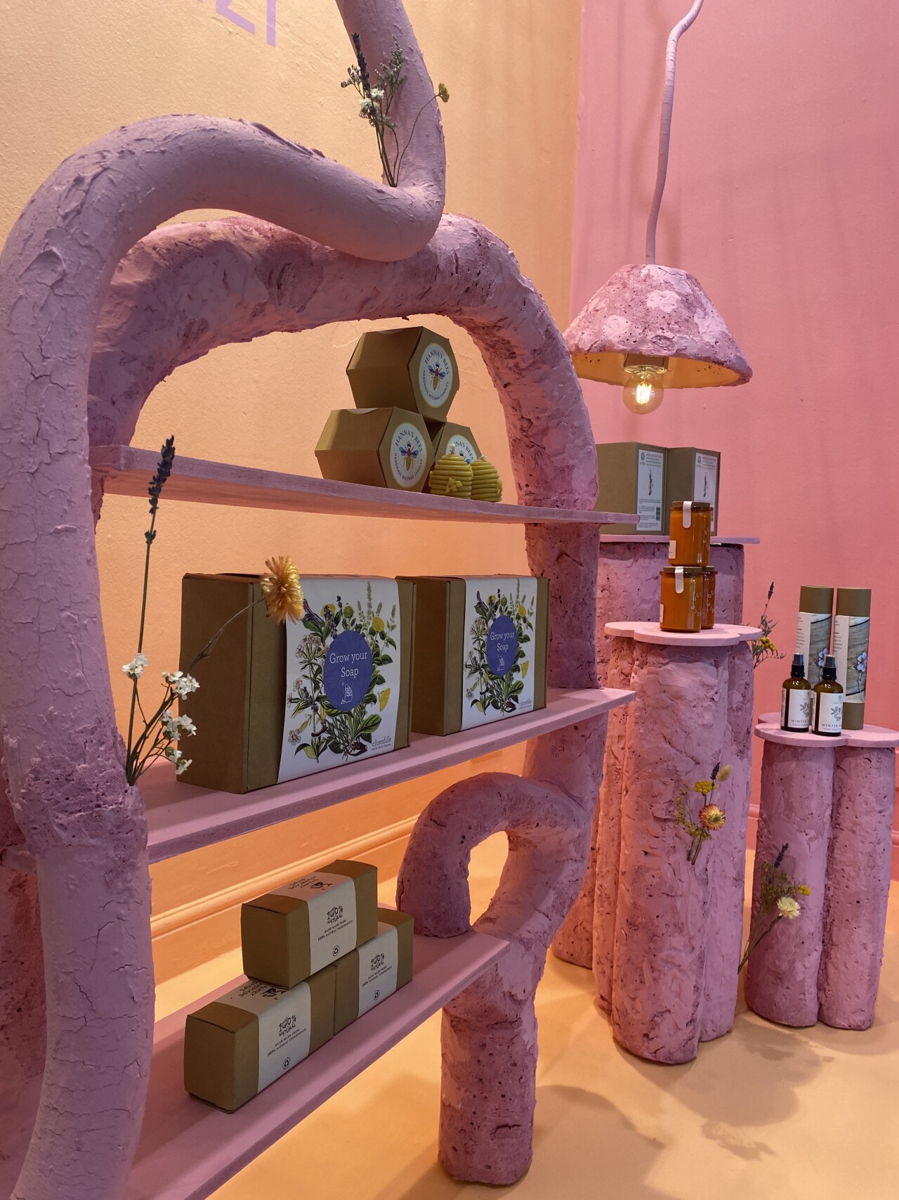 My final year window installation was designed for the Kilkenny Design store. I developed a concept centred around the Irish brand 'Reuzi.' My goal was to reach a younger clientele. Reuzi is a sustainable and eco-friendly brand. My design is about the exploration of organic shapes and textures. I created forms by layering and manipulating various materials, including recycled cardboard, MDF board, expanding foam, plaster, and paint. I spent time carving, sanding, and moulding the materials to create my vision. I wanted to combine delicate florals with raw, imperfect sculptural pieces.