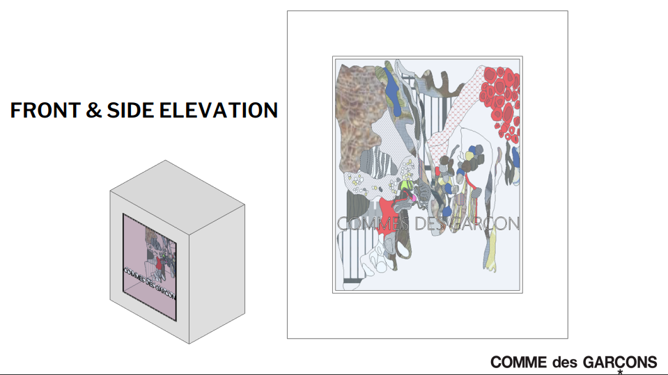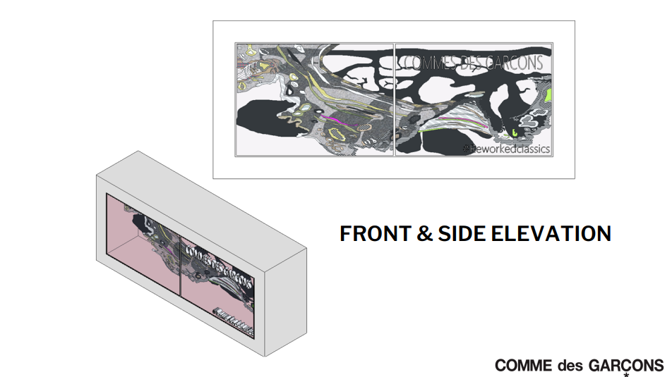 For this idea, I want to promote the recycling of textiles and reproduce Rei's famous and well-loved anti-fashion lines. I would make tapestries that would hang in the window using leftover materials from the SS 23 collections and the classic destroy collection.