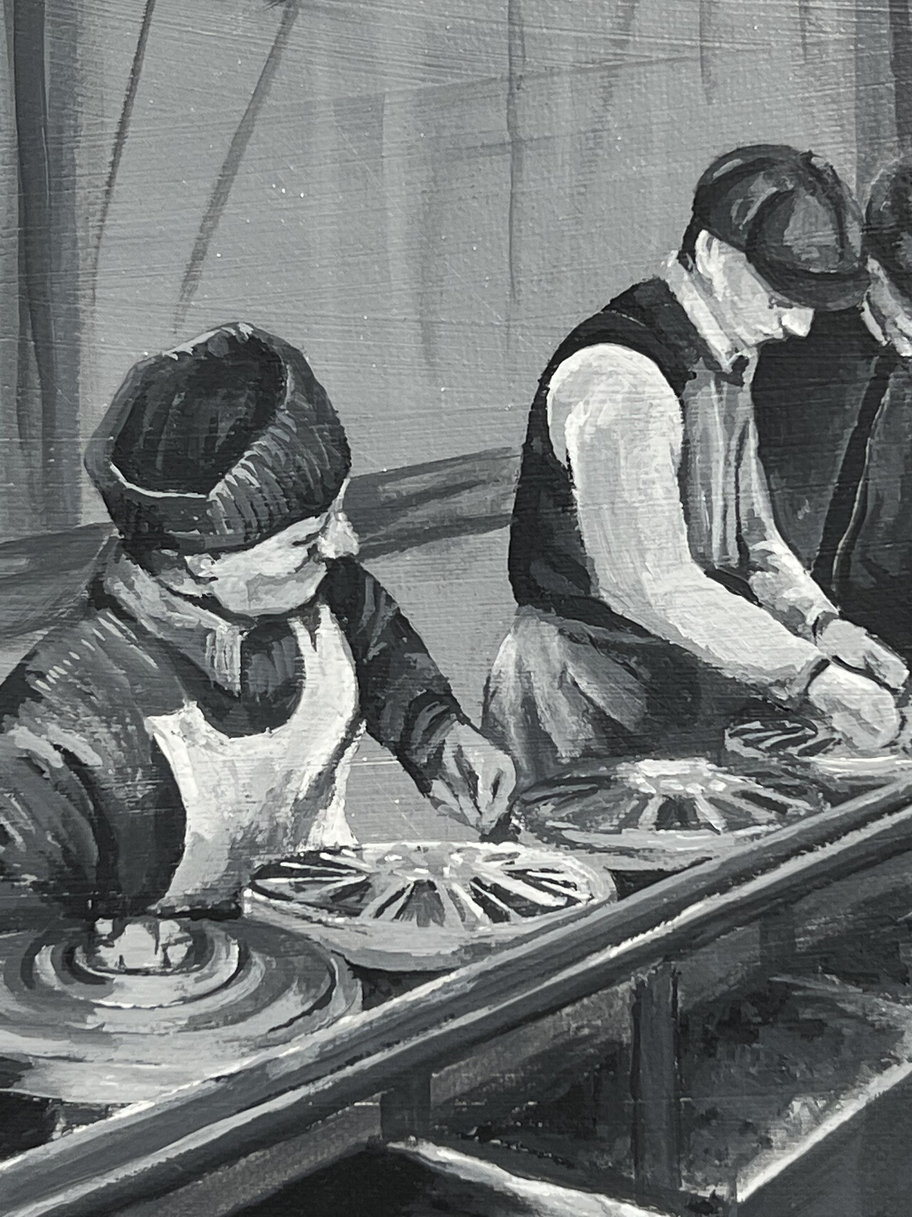 One of the painted works depicts the Henry Ford assembly line manufacturing process which was the first formal monotonised work practice. Drawing inspiration from this set of social conditions, the use of industrial materials such as sheet metal and coarse steel wool in my artwork references the repetitive and monotonous nature of manual labour. The serial application of steel rubbing in anticlockwise motions serves as a subtle protest against the regimented structure of the working day, highlighting the limitations imposed upon labourers. It is an action in protest against the clock.