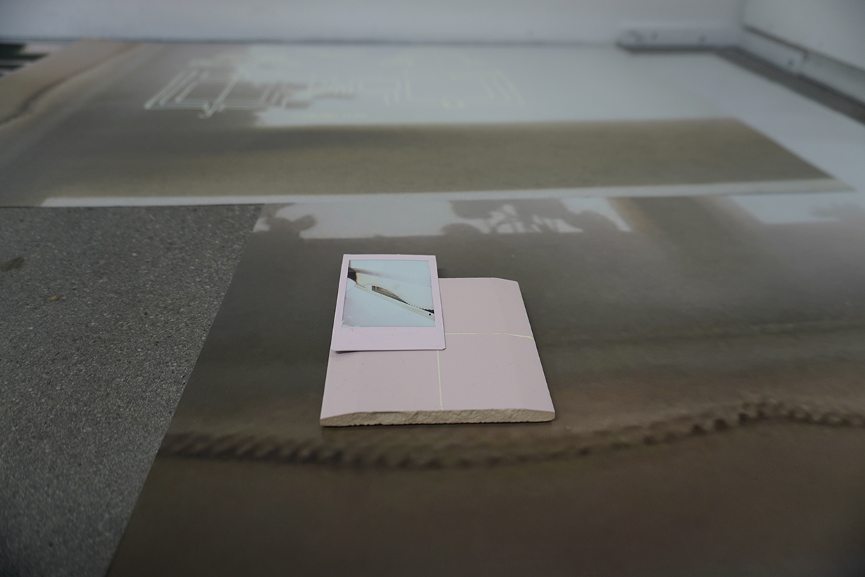 An A1 Inkjet print, originally from a polaroid, with the architectural plans for the Fern house in the Botanical Garden drawn on, is placed on the floor, next to an old bathroom tile with a collection of artefacts from her garden, as well as the original polaroid. Through this collection of things, she makes different photographic prints of different values explicit to each other.