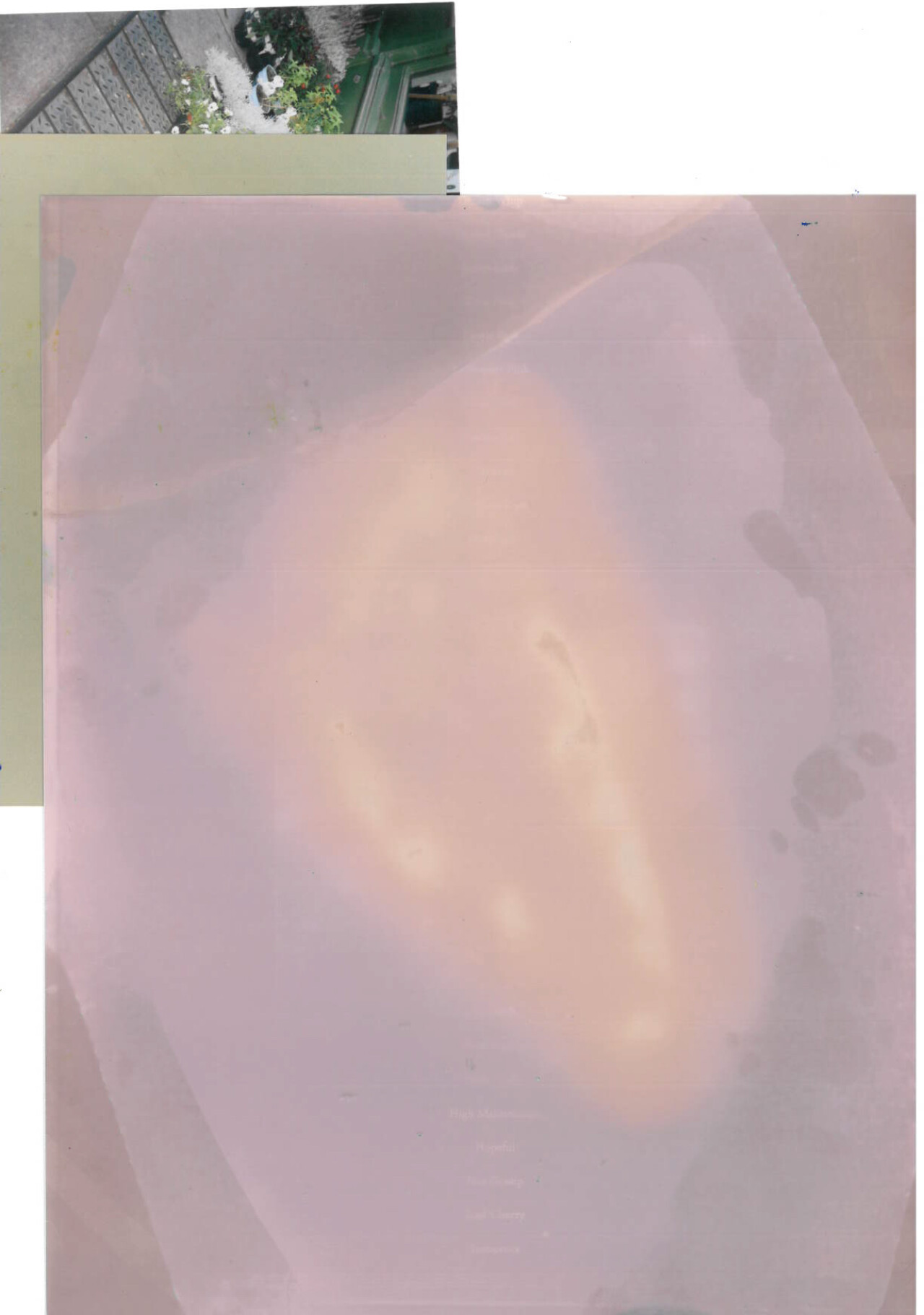 Alternative photographic processes are used to articulate decorative architecture specifically, the shade of pink, the colour that adorns her bedroom walls, and to document the architecture of light within the spaces. The lumen prints ‘This was made on my windowsill’ capture lunar and solar movements throughout her bedroom, with dusty pinks and lavenders regressing next to yellow shapes. Also exposed onto them is a list of pink colour names, from ‘Angel Kiss’ to ‘Valentine’s Memories’, creating a script for some of the pinks used to draw measurements.