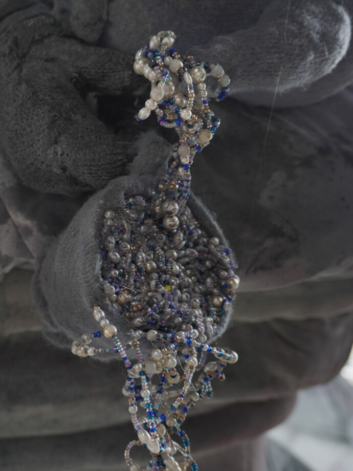 My art is concerned with the historic fetishization of lesbians in media, counteracting its harmful irreverence with soft textile depictions of earnest lesbian love. The works draw on personal experiences of harmful lesbian stereotypes, reflecting on them while producing sapphic art absent of this egregious sexualisation. I use repurposed materials to further my works sentimentality. The concept of soft power and peaceful protest through textiles is central to the narrative of my work and choice of materials. My body of work is entitled Our Moment in Time. The primary piece is a textile fountain with two women at its centre. As one leans in for a kiss on the cheek, they forget about the tea in their hands which spills out to form the water. The fountain, Note and Locket exist within the same narrative, allowing the viewer to glimpse into a sapphic story unobstructed by objectification.