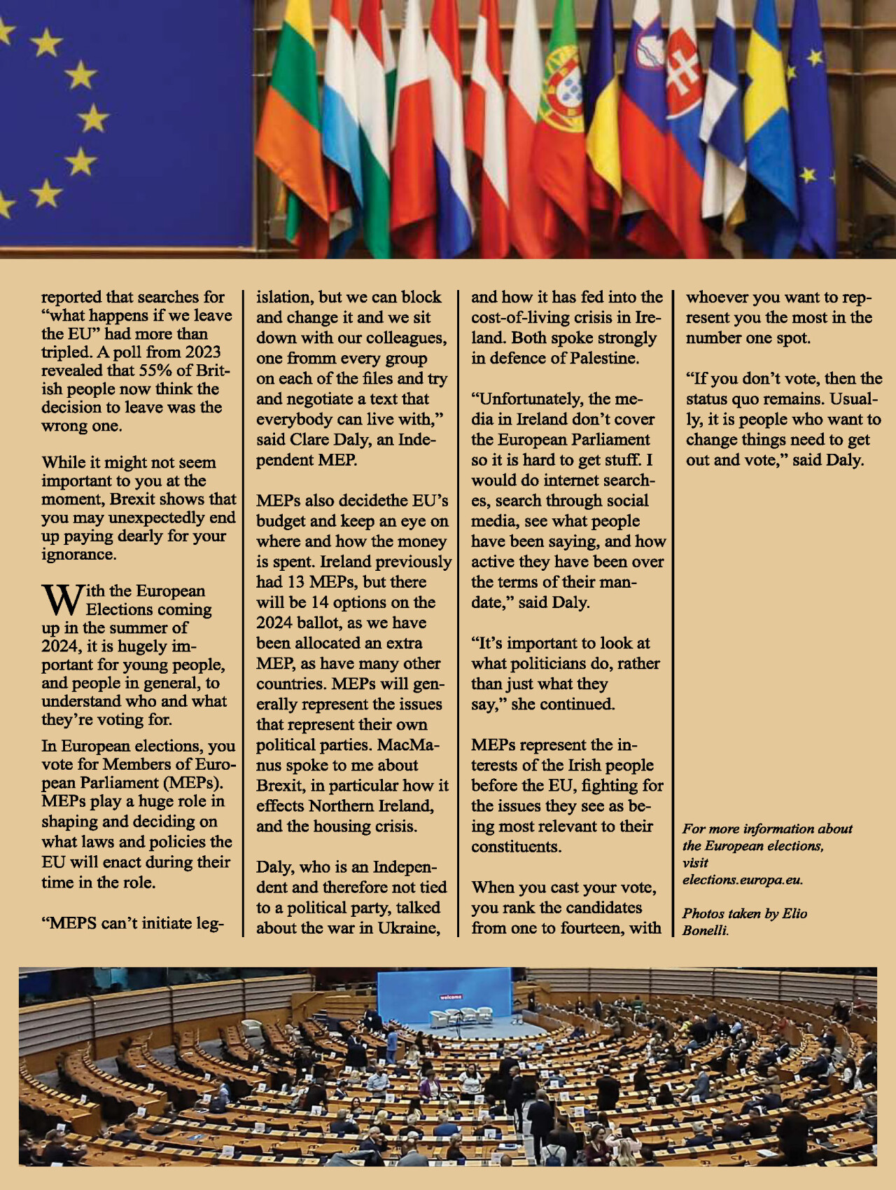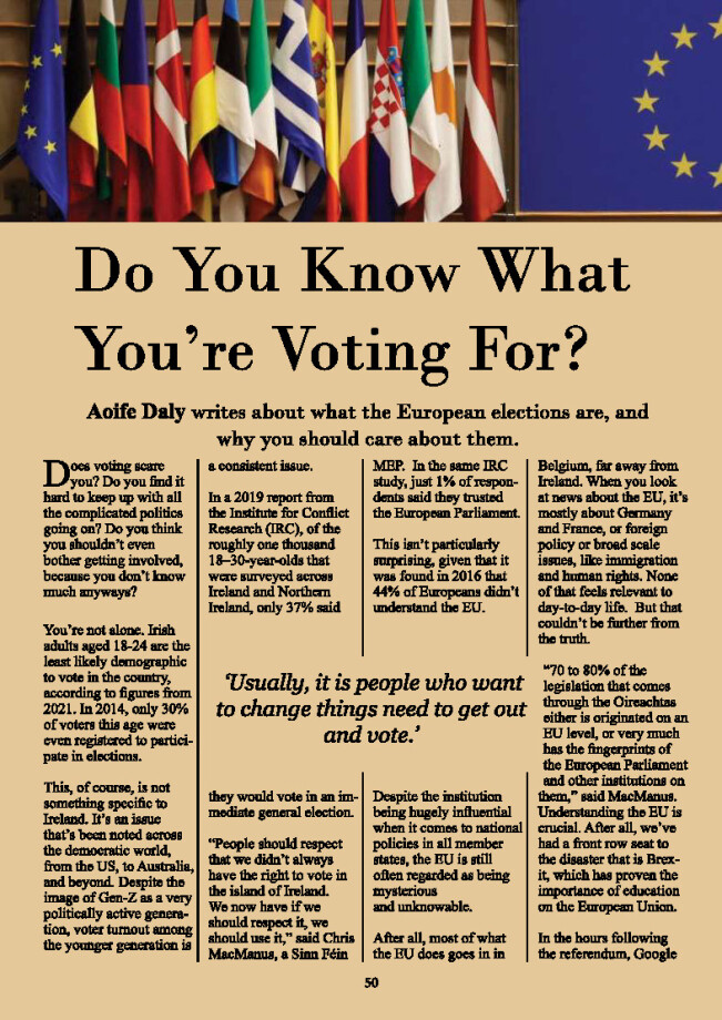Aoife Daly is the Editor in Chief of Currently, which was awarded Magazine of the Year at the 2024 National Student Media Awards. Her two articles ‘Home Away From Home’ and ‘Do You Know What You’re Voting For?’ look at Gaeltacht an Oileáin Úir, the only recognised Gaeltacht outside of Ireland, and why young people should be interested in the upcoming European Elections.
