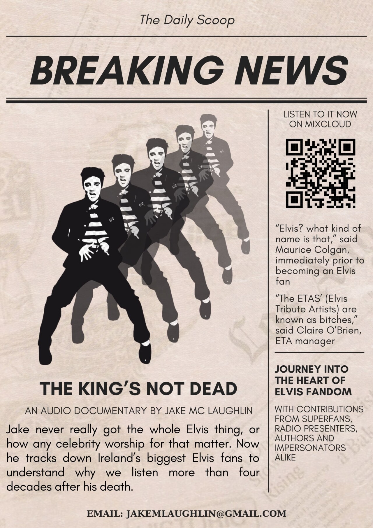 I don’t know if you know any Elvis fans, but I sure do. It’s a section of pop culture that always seemed beyond me. Even my favorite obsessions come nowhere close to the level of dedication Elvis fans have. It bugged me for years, so when given the chance to produce a radio documentary I knew exactly what question I wanted to answer. The result is The King’s Not Dead, a quasi-journey into Elvis fandom. Where I track down Ireland’s premiere Elvis fans to finally figure out what the big deal was. My guests stretched from superfans to authors, radio presenters to impersonators, all angles of the Elvis world. Though from wildly different backgrounds they all shared the same admiration for Elvis. A man who heavily impacted their lives even if they never met him.