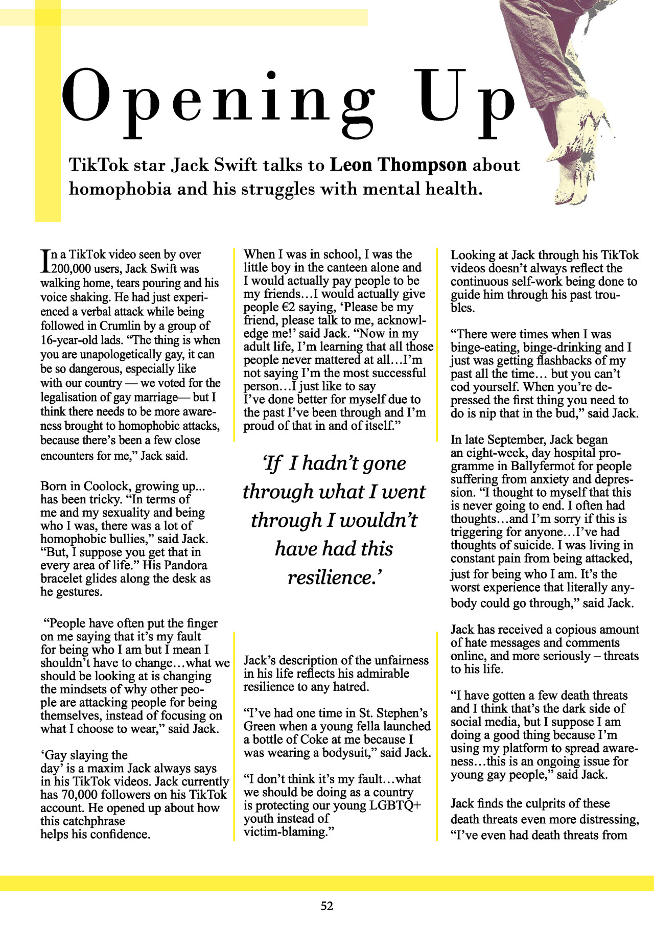 The glimpse of Jack through TikTok doesn’t always reflect the continuous self-work being done to guide him through his past troubles that still pop up. “There were times when I was binge-eating, binge-drinking and I just was getting flashbacks of my past all the time… but you can’t cod yourself. When you’re depressed the first thing you need to do is nip that in the bud,” said Jack.