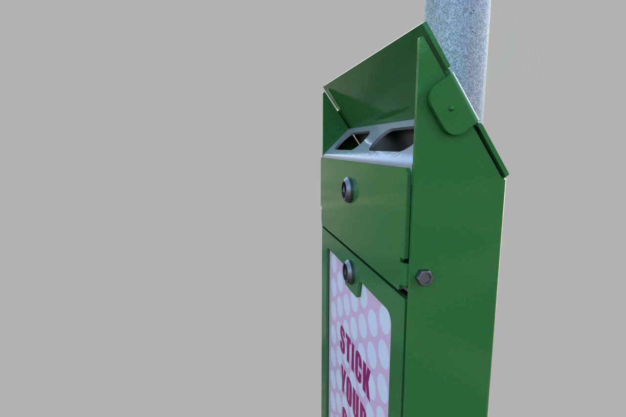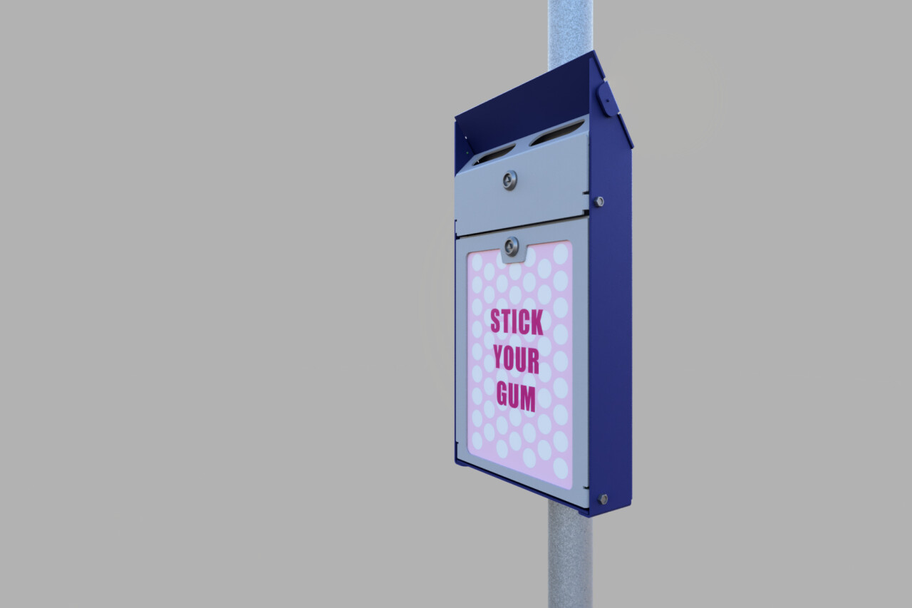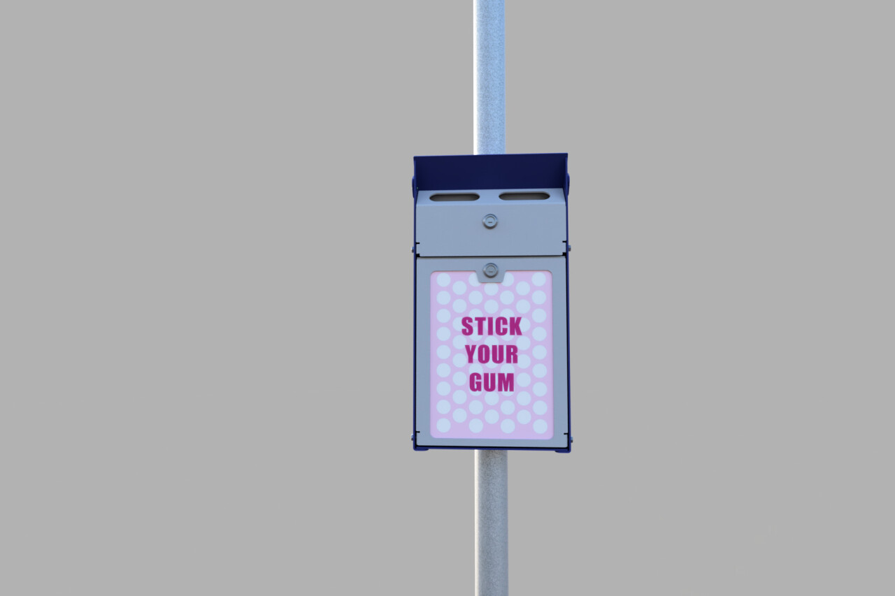 The StickSpot is a chewing gum disposal unit designed to tackle the pervasive problem of improperly disposed chewing gum in public and private places. This solution offers an easy way for people to dispose of their chewed gum responsibly, reducing environmental and economic impacts associated with chewing gum litter. It serves as an interactive design installation tool that engages the public about the consequences of gum litter and promotes responsible waste disposal behaviours. The StickSpot can be tailored to fit specific settings or branding needs to enhance its appeal and visibility. Chewing gum litter prominent issue that is often neglected.