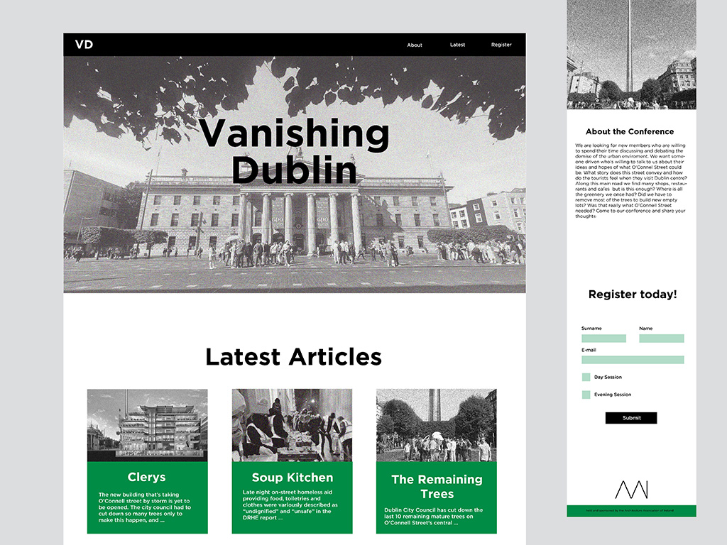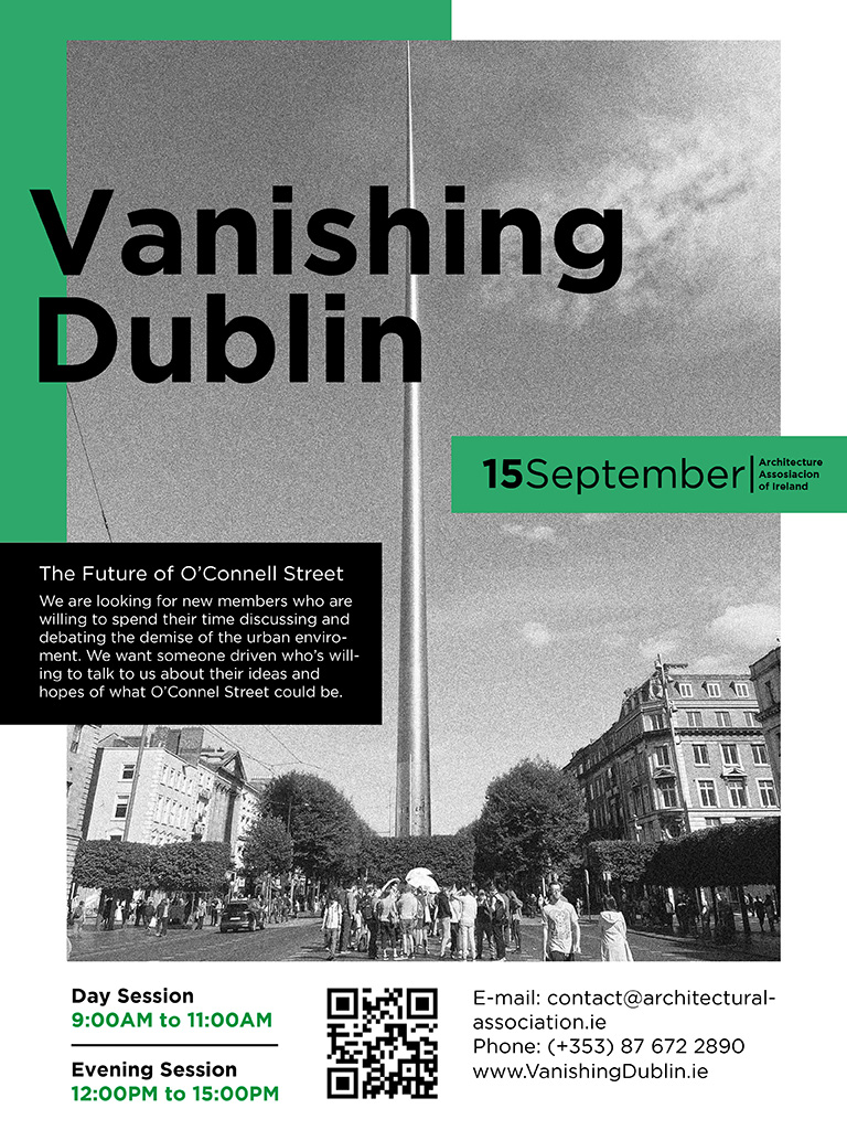 Looking at the history and significance of O’Connell Street, we had to ask ourselves if this principal street still holds the strong symbolic value it once had. Despite the increasing number of vacant buildings and false facades, O'Connell Street remains a major traffic route and tourist destination. To encourage the next generation to care more about the history of the street, I developed a print and digital platform that informs and connects various perspectives. We encouraged people to share their opinions by attending an AAI (Architectural Association of Ireland) conference to ensure that O'Connell Street retains its primary symbolic importance while also regaining its claim as a vital core of the city centre.