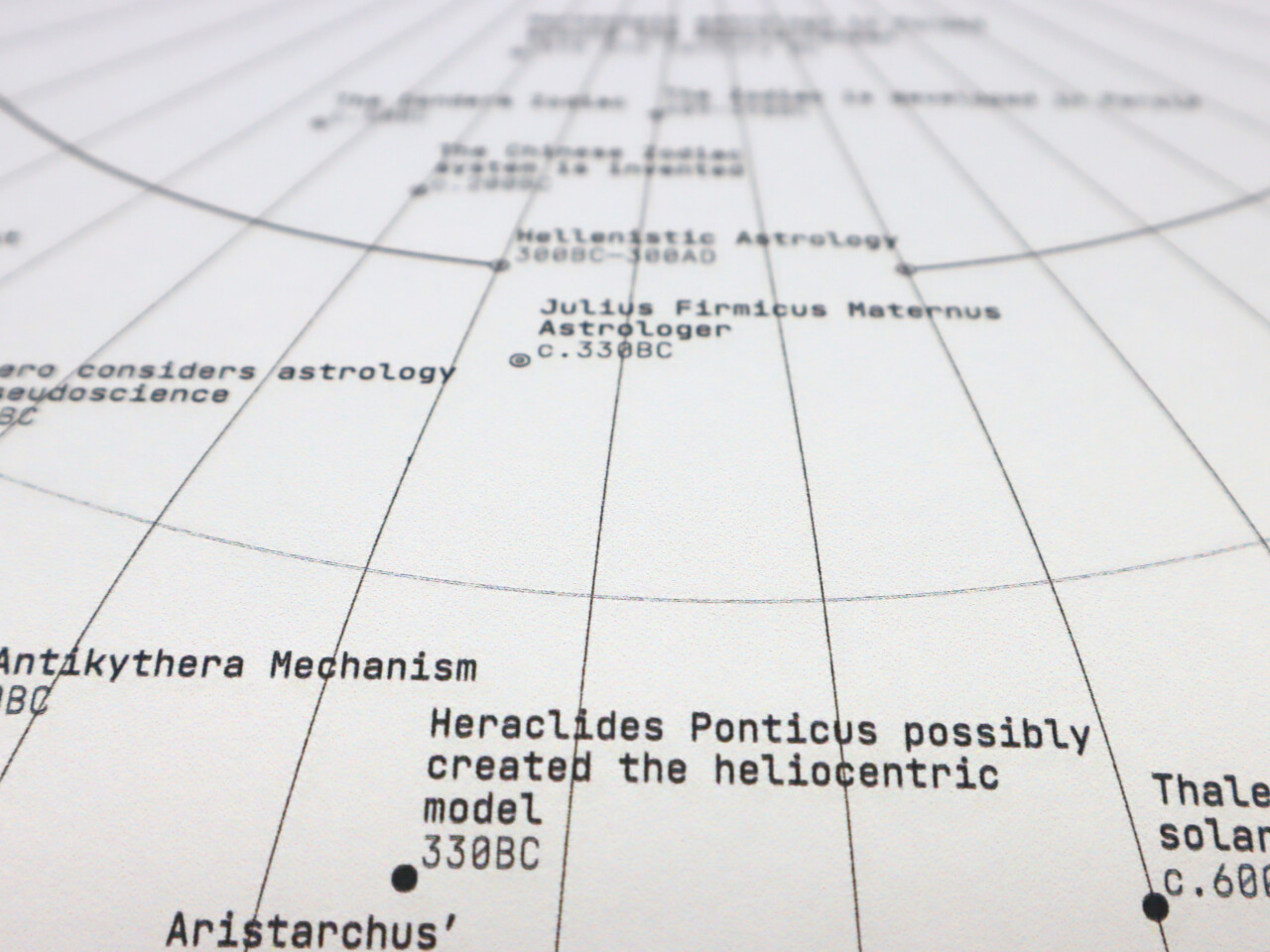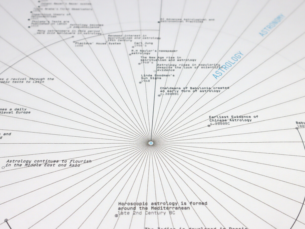 Astronomia is a large format publication which explores the development of Western astrology, alongside the simultaneous astronomical advances. The publication features a large fold out circular timeline, alongside a series of photo cards which align with segments of the timeline. This project was developed through continuous historical research which influenced the outcome of the piece.