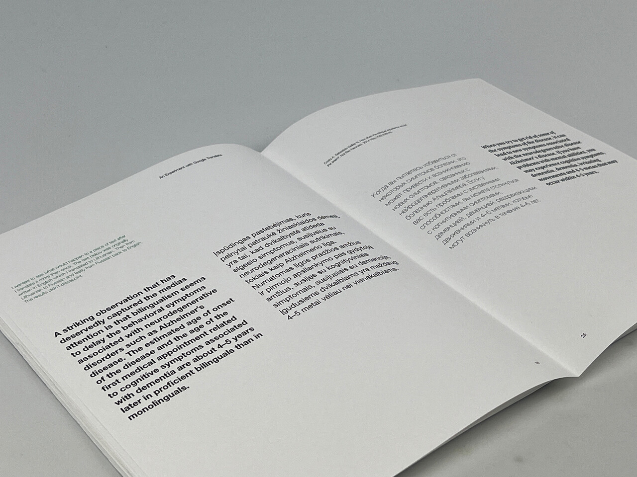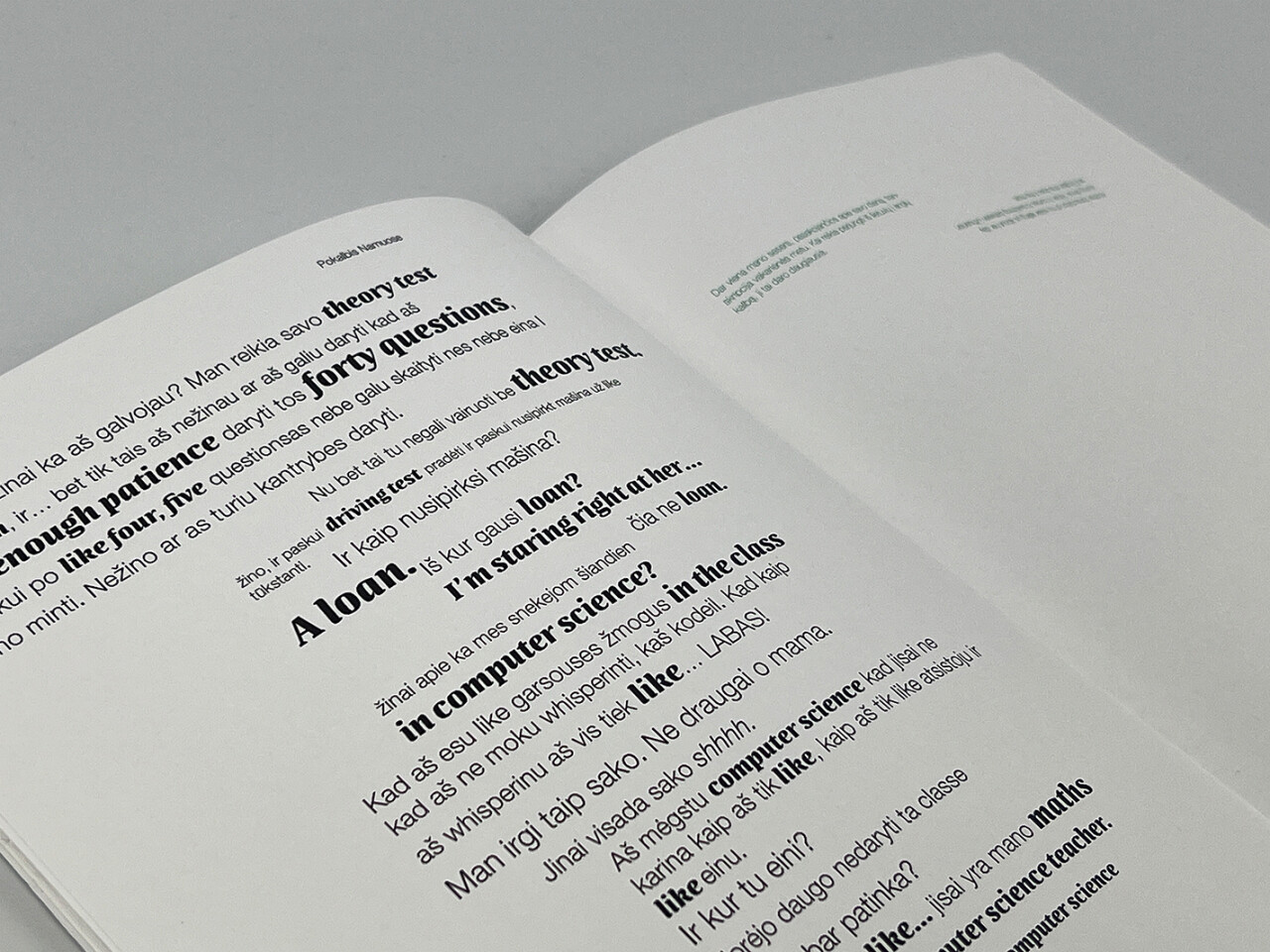 This project is in response to the ISTD “Linguistic Hybridity” brief. The brief asks us to choose an example of linguistic blending and analyse the way in which different languages are coded and deciphered through typography. For this project I used my own personal experience of growing up bilingual as a Lithuanian. It includes typographic examples of code switching and code mixing as well as scientific research into the effects of bilingualism on the brain. Some examples include conversations between myself and my family and a lexicon of hybridised Lithuanian and English words. The aim of this project is to connect with other people who were raised bilingual, whether that’s other Lithuanians who speak English to relate to or others who speak more than one language. It also gives monolinguals an insight into the ways others may communicate with their friends and family in a way they haven’t experienced before.