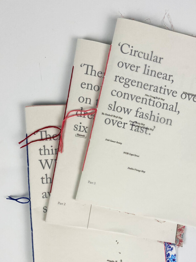 Leah Clarke is a multidisciplinary designer based in Dublin. The body of work she has created throughout her studies at TU Dublin strongly emphasises her interest in sustainability, craft, second-hand lifestyles and gender equality. Leah’s design philosophy is rooted in her assertion that designers have a responsibility to consider the social, cultural and ethical impact of their work, which she explored in her thesis, Designing a Narrative: A Multimodal Analysis of HIV Awareness Campaign Videos. Drawing on her background in textiles and craft, Leah has a very hands-on design approach. A combination of continuous iterations and in-depth research guided her design processes. She was awarded a D&AD New Blood Pencil for her project ‘What we leave behind...’, which displays some of her key areas of interest, namely typography, animation and image-making.