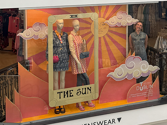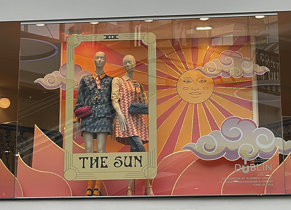 I designed a window installation for Arnotts in Dublin during my final year, which I created using Sketchup, V-Ray, and Adobe Illustrator. My inspiration came from the WGSN S/S24 trends "Bohemian Alchemist," "Acid Retro," and "Digital Dune." These trends inspired me to create a bold and exciting window installation. The inspiration for my installation came from a tarot card design that I discovered during my S/S24 research. The Sun tarot card explores elements of astrology and spirituality with retro psychedelic themes and colours. In my installation, I brought "The Sun" card to life in a playful and bright setting, using foam board cut-outs to create layers and forced perspective to create depth in the narrow space. I also used a gold holographic vinyl on the edges of the sand dunes and sunrays to give the effect of light and reflection.