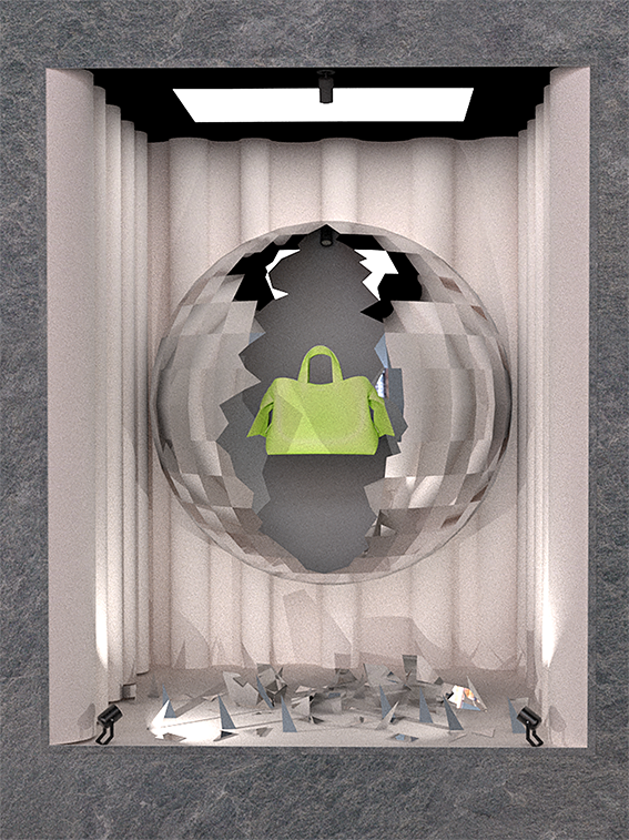 For my chosen window concept, I was heavily influenced by the Acne Studios SS24 runway design. The runway featured a giant disco ball in cement and plaster tones crashed into the corner of the neutral-hued fashion set design, spilling its reflective shards on the floor, and mirroring its surroundings through its broken pieces. The sharp contrast between the reflective broken disco balls and the soft beige surroundings created a dramatic effect.