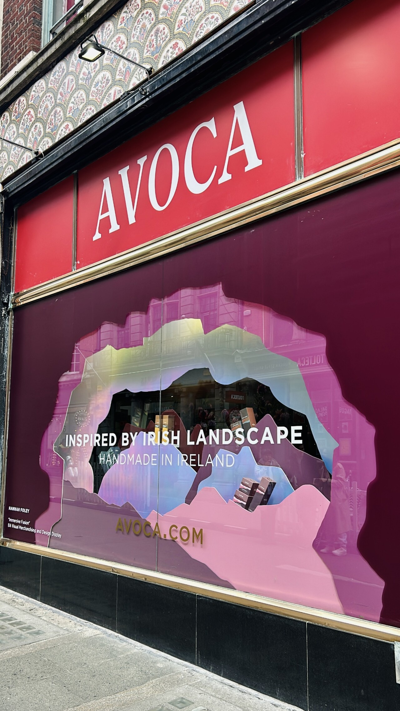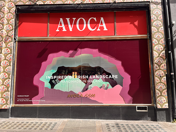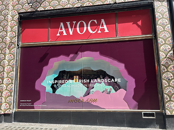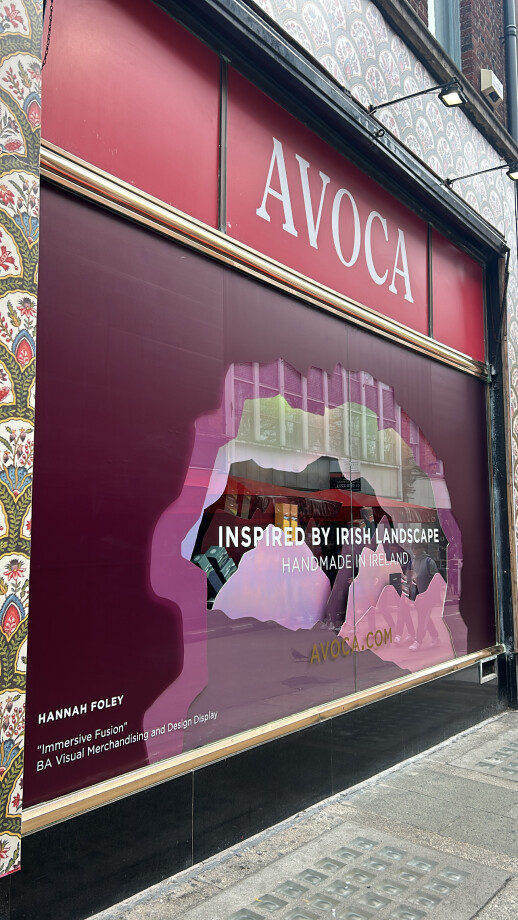 My final year project involved designing a display for Avoca's Suffolk Street store. I drew inspiration from their Rathborn collection, a series of diffusers and candles that beautifully capture the essence of the Irish Landscape. To recreate this, I carefully selected a purple colour palette from the collection, adding an iridescent colour for a modern twist. This thoughtful choice was in line with the packaging, which features a 2D drawing of mountains. I recreated this drawing in the window space, designing the mountains to fit into a cave-like shape for depth and interest.