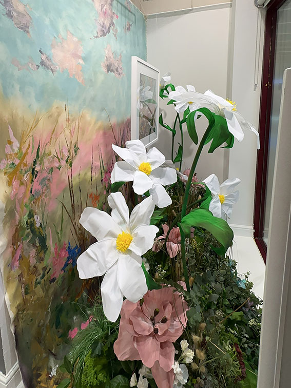A wild meadow, grasses, and 3D daisies made of crepe paper were hand-created. The canvas backdrop was curated and hand-painted to mirror the artist's work. The scene exaggerates to create the illusion of turning the artist's work into reality and brings attention to the craft-making world. The psychology of display is to create a scene where you are drawn in by the window theatre, and then the eye focuses on the product, where, indeed, you are teased to focus your attention on the artwork itself. This is, in turn, is, "Creative Confidence."