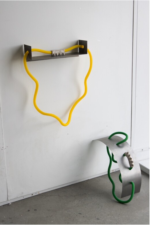 This body of work considers the ‘permanence’ of human waste and its effect on other living and non-living things. My work takes the form of sculptural assemblages, whose parts engage with each other materially and spatially. These sculptural assemblages propose to explore ideas of waste or matter, such as human made plastic, as having lively qualities. The sculptures are composed of pre-existing objects such as industrial plastic, metal and foam that connect and entangle with each other via handmade art interventions made from silicone, ceramic and stuffed fabric. The organic and bodily forms in the handmade objects disrupt the visual language and industrial intentions of the pre-existing objects. The merging of materials speculates how future species might adapt or make use of our waste by growing around, on top of, or within debris.