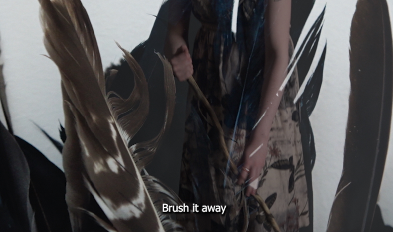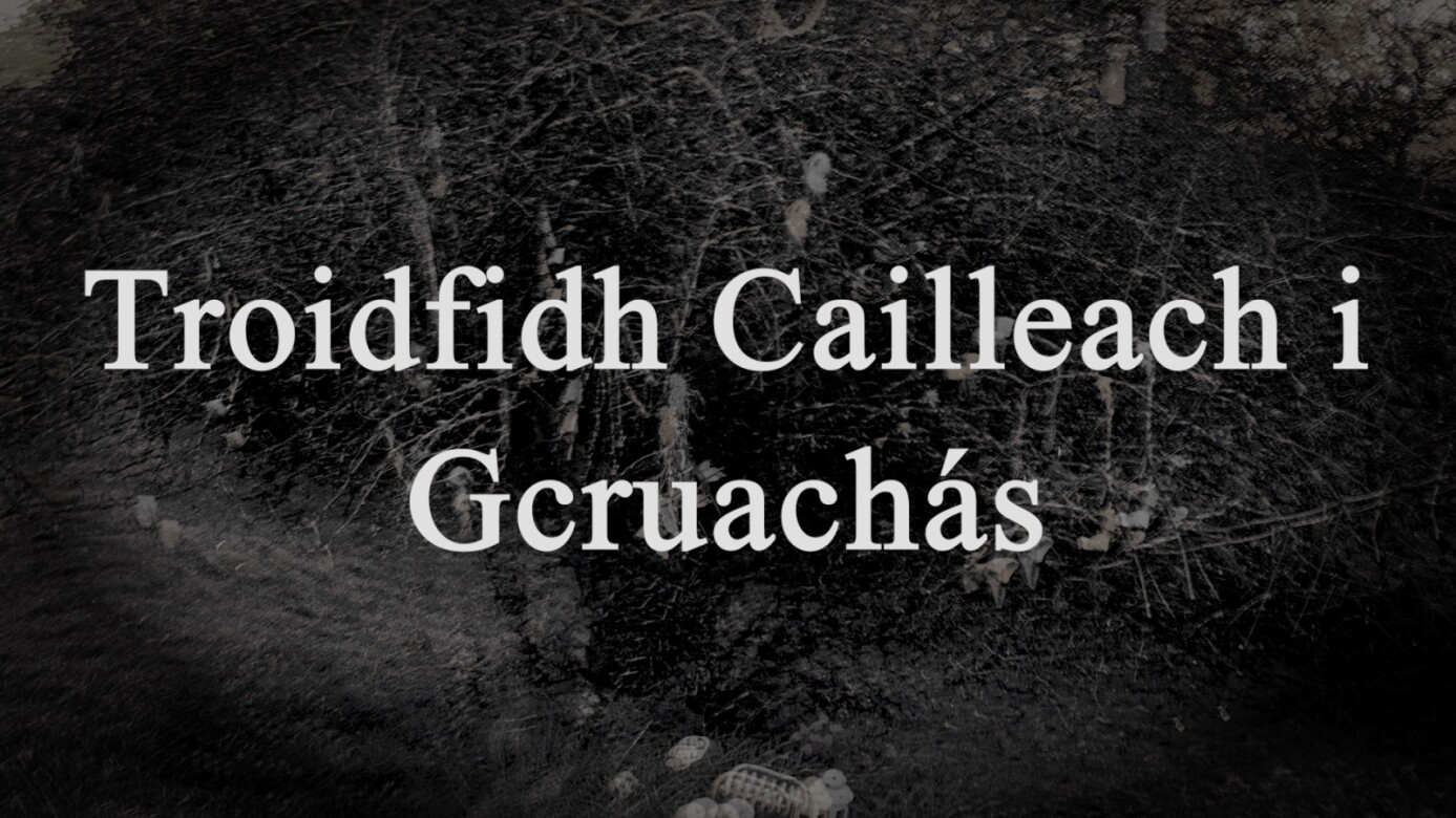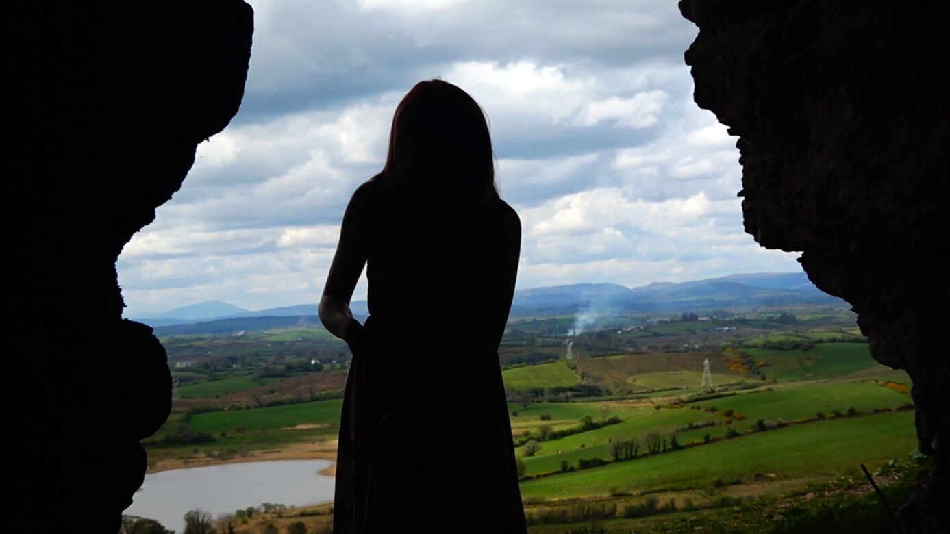 Troidfidh Cailleach I Gcruachás explores themes of witchcraft and feminine resistance through an Irish cultural and mythological lens. Woven from site's specific footage from historically rich locations in Ireland such as The installation consists of a film, projected on the center wall, an image displayed on a screen to the right of the film and a broom suspended on the left of the film. The broom is handmade using a branch of a fallen tree and a collection of miscellaneous bird feathers. The film contains a script written by the artist and performed as Gaeilge, the film reclaims Ireland’s ancestral voice an evocative act of reviving cultural memory and echoing traditions that time has begun to quiet. Central to the work is the invocation of The Morrigan, a Celtic goddess associated with war, fate, and transformation and the near-forgotten ritual of keening, a visceral expression of collective mourning and ancestral connection.