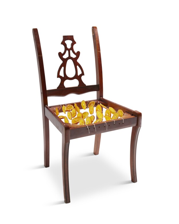 It is a multidimensional installation combining a range of materials and artistic strategies. Materials include net curtains, dried oranges, a dinner table and chairs, crochet, jesmonite, box-bar steel frame, concrete, insulation, rebar, video, and large-scale screen-prints of archival architectural plans.