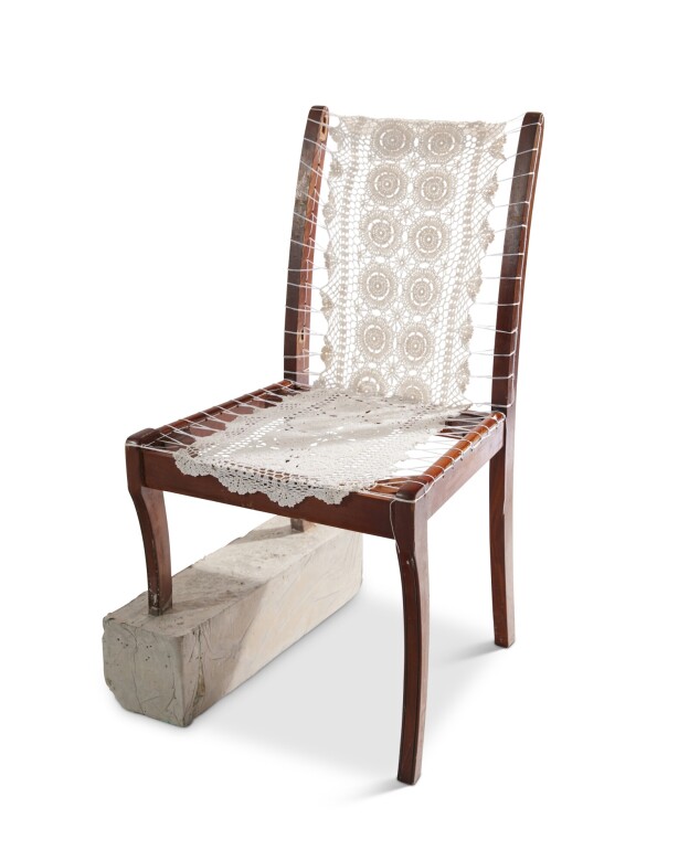 The work engages with or references materials from my grandparents’ apartment. The contrast between the domestic and the structural elements highlights the tension between fragility and durability. The work embodies themes of scarcity and hardship. It functions as a reflective medium through which memory, deprivation, architecture and identity, architecture and politics, and the passage of time are explored.
