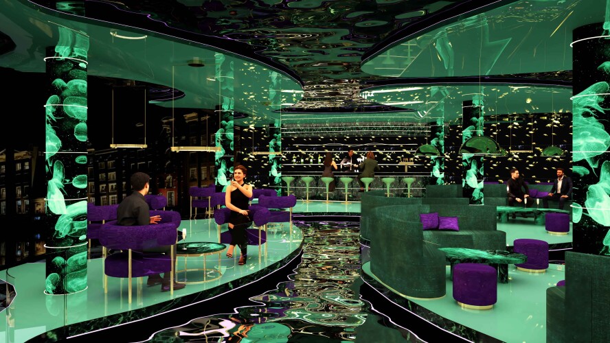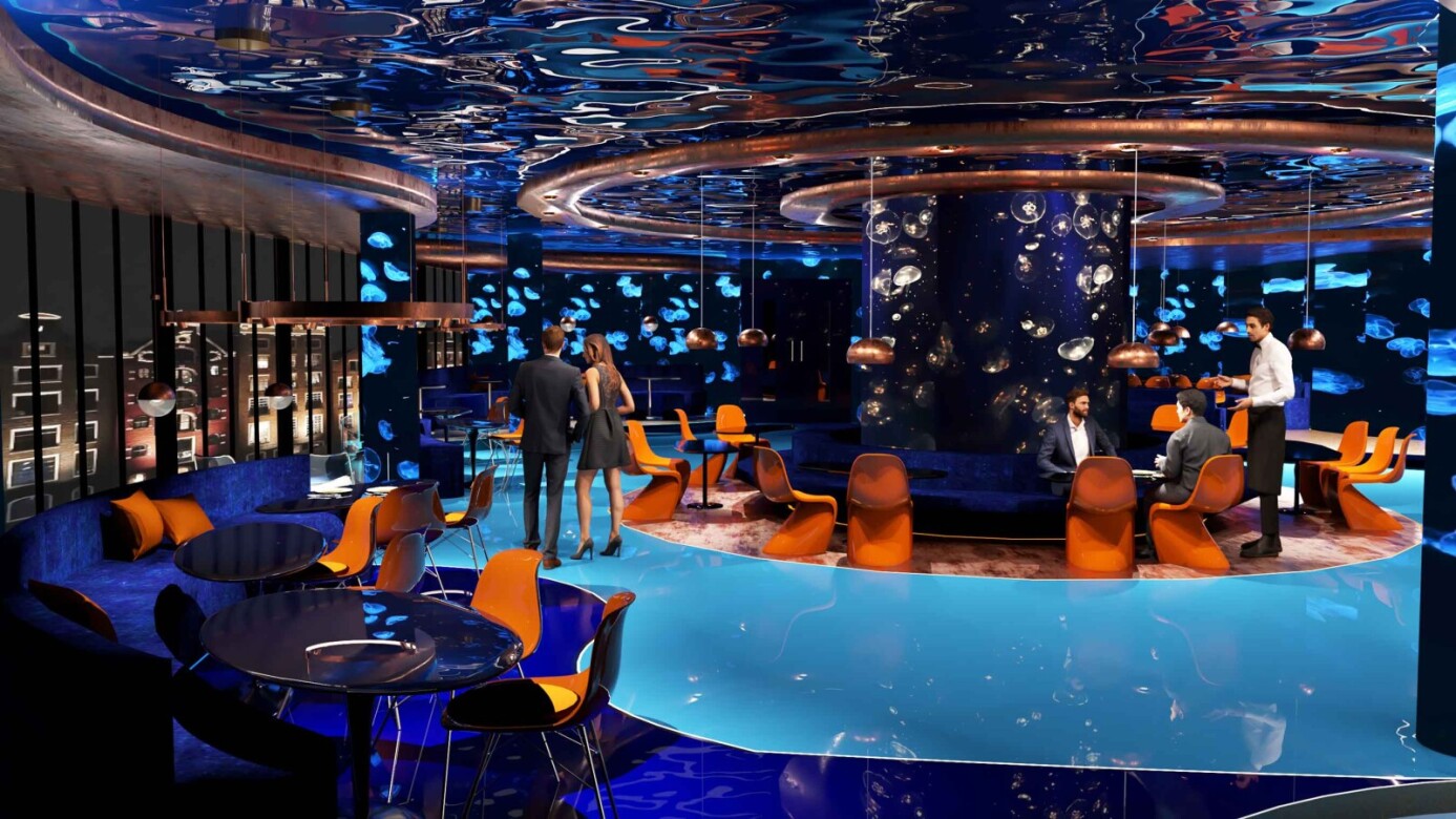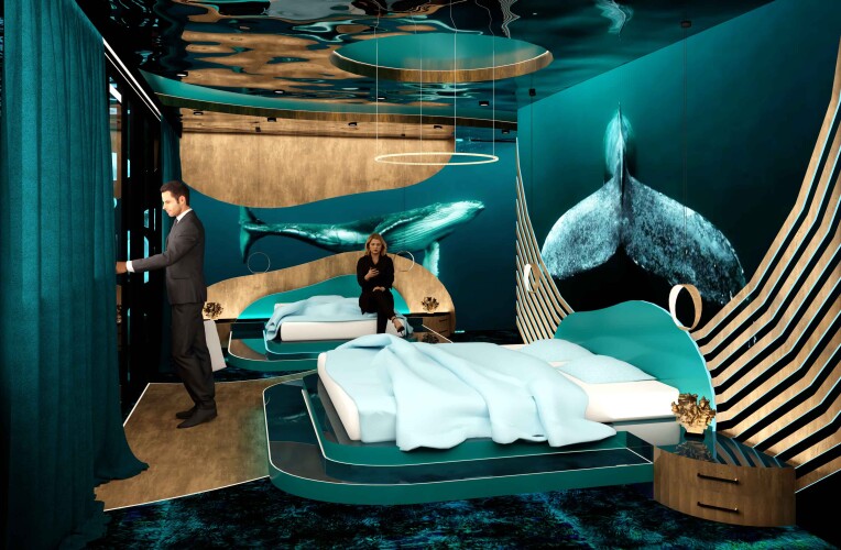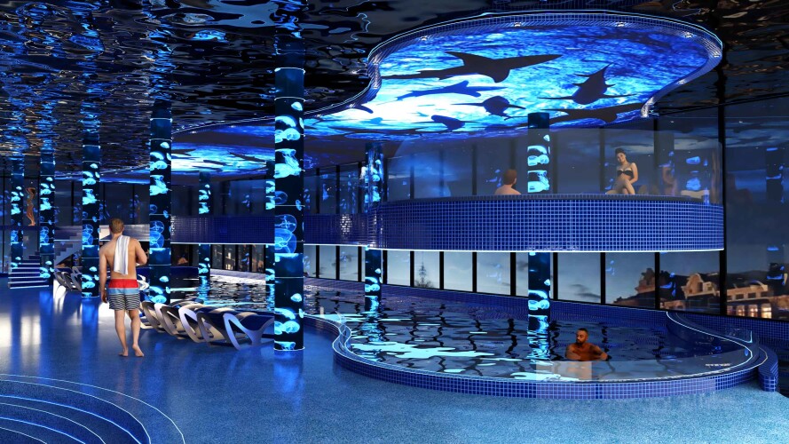 A key feature of the interior concept is the use of digital walls, displaying dynamic, high-resolution visuals of water and underwater life. These immersive installations are strategically placed throughout the hotel, enhancing the tranquil atmosphere. The vibrant colors of the water and surrounding environment are reflected in each interior, with different spaces featuring their own distinct color palettes inspired by the dynamic hues of the water and its surroundings. This use of color adds depth and energy to the hotel’s design, further connecting guests to the natural surroundings.