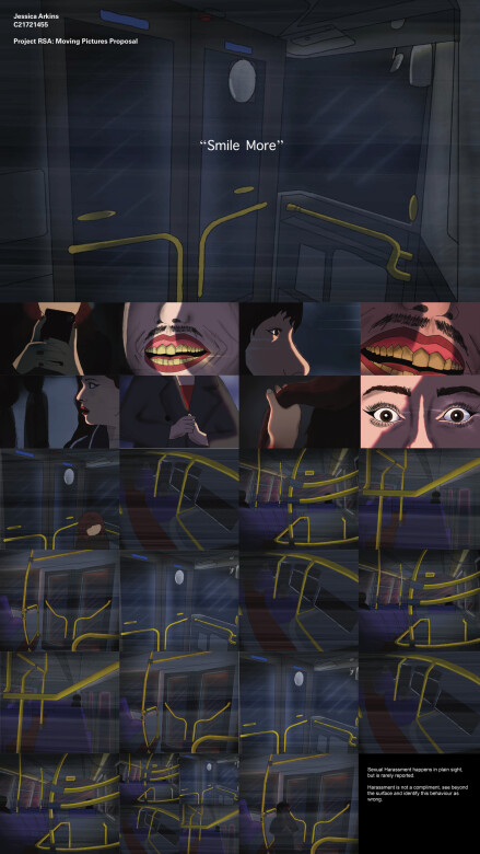 The use of distorted perspectives, subdued colour palettes and absence intervention reflects how harassment is normalised and dismissed in plain sight. It challenges the idea that harassment is harmless or flattering, urging viewers to recognise complicity in silence. The storyboard emphasises the invisibility of female trauma and the failures of societal systems, like surveillance or public protection. This short-film proposal calls on audiences to look deeper and reflect on their role in building change.