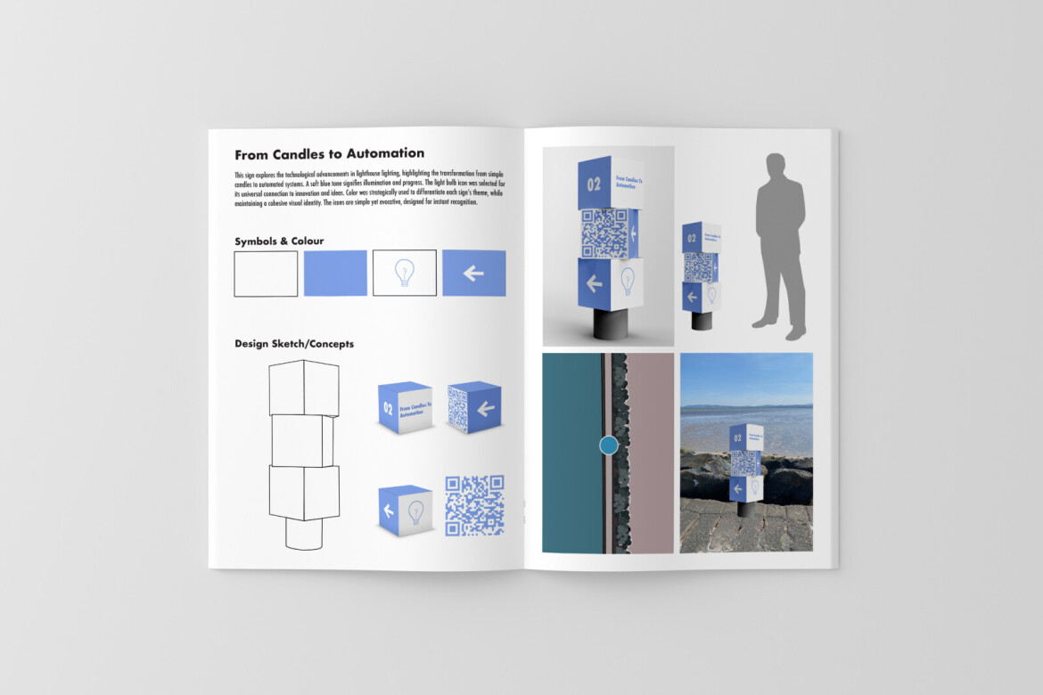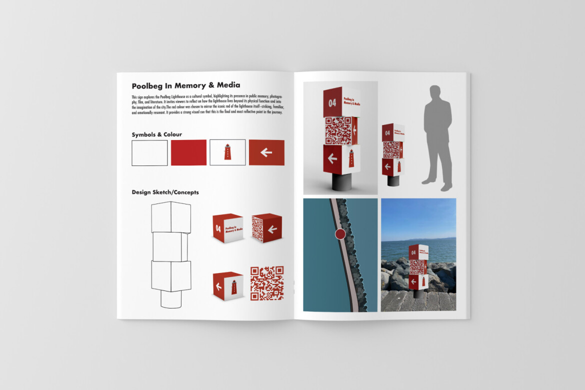 “Poolbeg Lighthouse, A Wayfinding Concept” is an interactive design project that explores the cultural and historical significance of Poolbeg Lighthouse through a blend of physical signage and digital storytelling..The project emphasizes user interaction, narrative immersion, and place-based memory, creating a multimedia journey that bridges past and present.It aims to leave the audience with a deeper appreciation for one of Dublin’s most iconic landmarks.This booklet presents conceptual designs and mock-ups for a proposed wayfinding system and story trail experience at Poolbeg Lighthouse. The project explores how interpretive design can enhance visitor engagement with the site’s heritage and landscape.