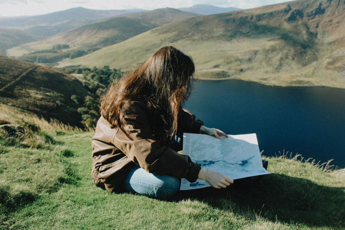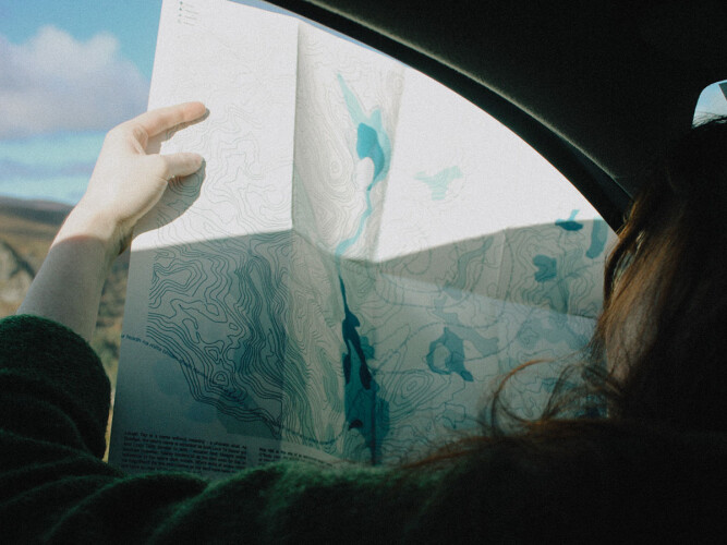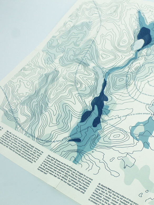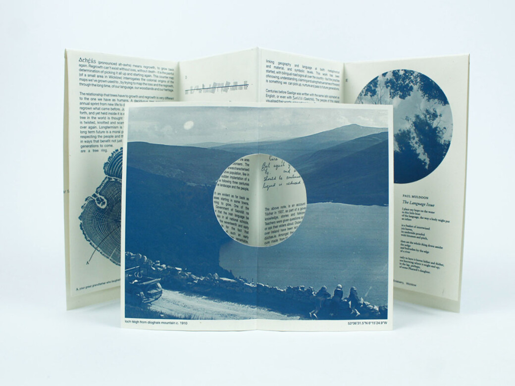 Athfhás means regrowth as Gaeilge. This is a map of colonial language loss, deforestation and near-forgotten local knowledge - but also of regrowth and remembering. The enclosed cut-out photos allow the walker to experiment with 'live-collage' as they ruminate on the lifespan of the mountains and trees around them.