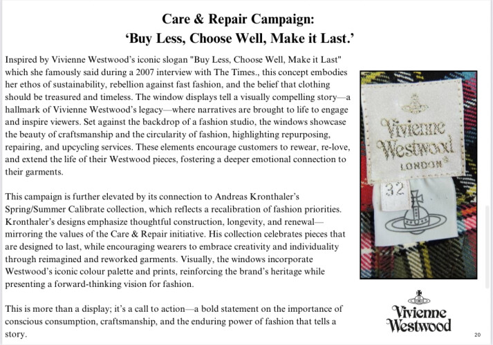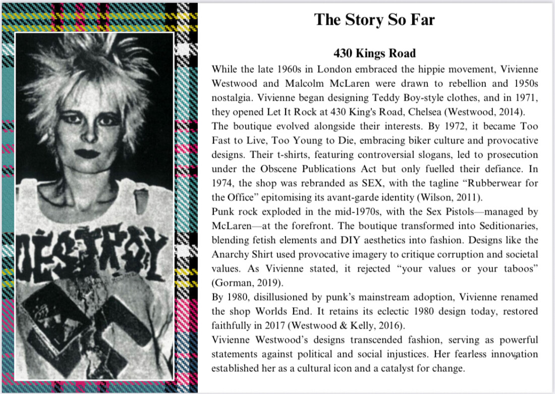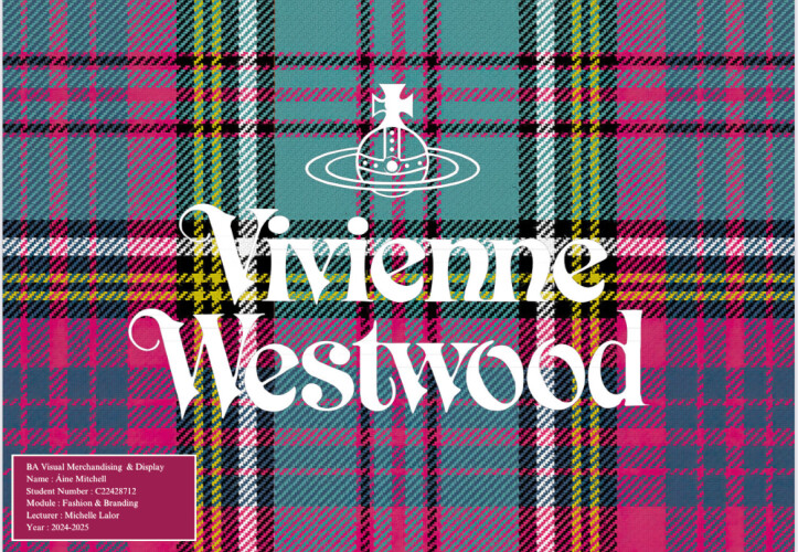 For this project, I immersed myself in the world of Vivienne Westwood, researching the brand’s rich history, values, and distinctive aesthetic. I explored how Westwood challenged norms through fashion, merging punk influences with political activism, sustainability, and historical references. I also analyzed past window displays to understand how the brand visually communicated its identity across different seasons. With this knowledge, I imagined myself as the creative director and developed a unique window display concept that honored Westwood’s rebellious spirit while incorporating my own ideas. My design balanced heritage elements like corsetry and tartan with bold messaging and modern styling to reflect the brand’s dynamic identity. I really enjoyed the deep dive into the archive and creative direction process—it gave me a stronger appreciation for how storytelling and design come together to build an impactful brand experience. This project helped me sharpen my research, design, and brand interpretation skills in a meaningful way.
