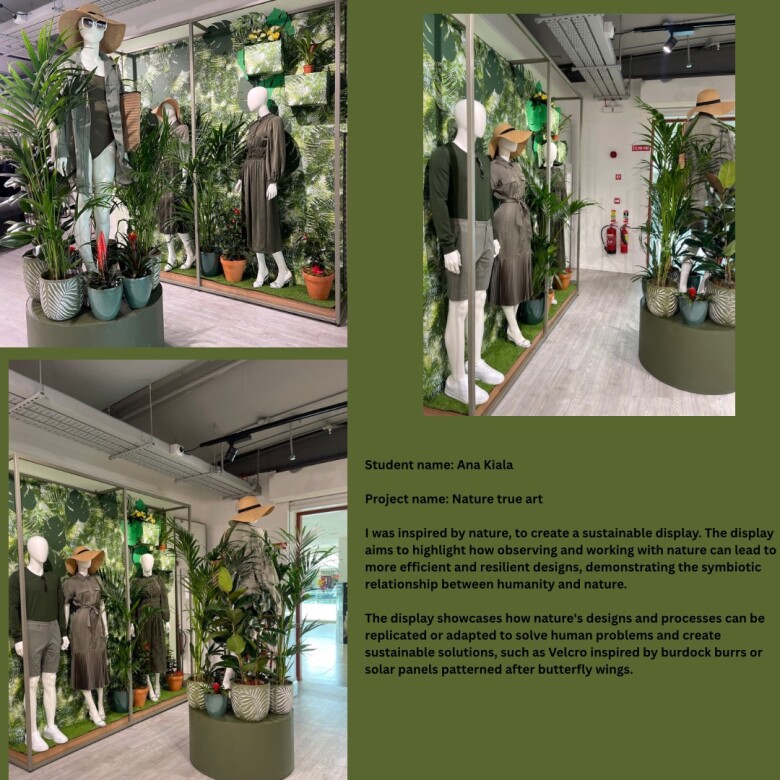I was inspired by nature to create a sustainable display. The display aims to highlight how observing and working with nature can lead to more efficient and resilient designs, demonstrating the symbiotic relationship between humanity and nature.