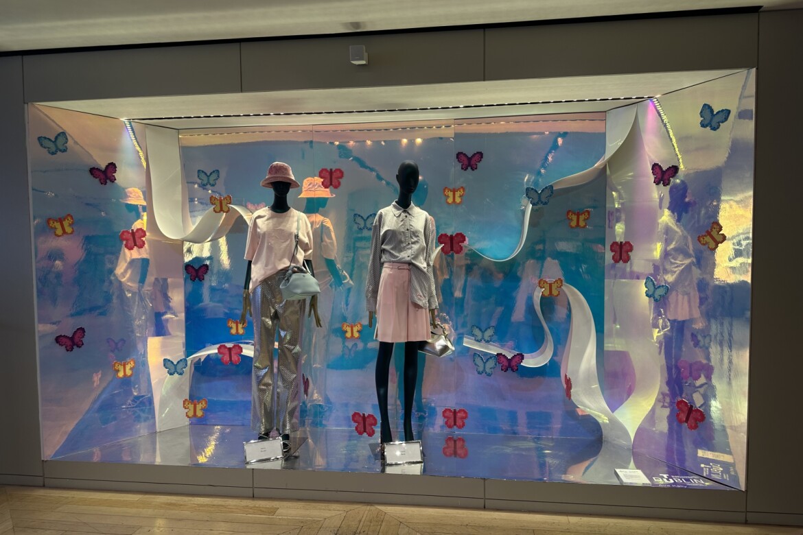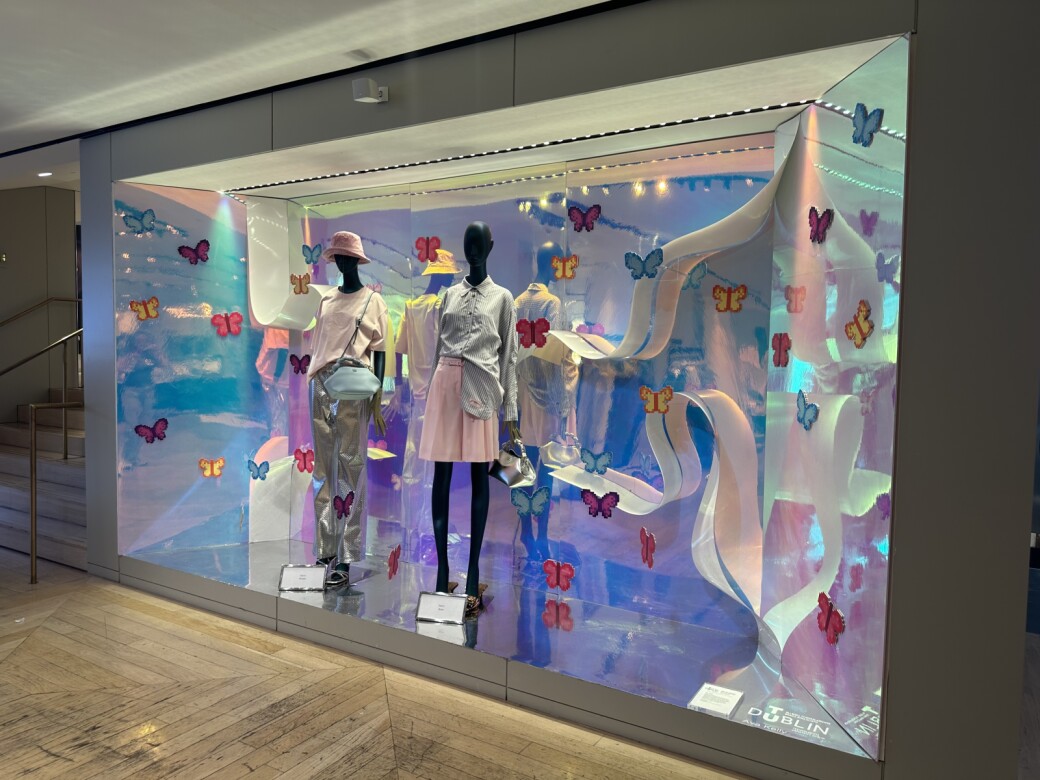 My final installation at Brown Thomas titled Nature in the Metaverse takes inspiration from a combination of WGSN trends including Preservation Mode, Strategic imagination & Flex-abilities. This display looks at how nature would survive in a digital world which is highlighted by the pixelated butterflies. Adaptability is it at the core of the Flex-abilities trend which is emphasised by the flowing curves representing movement. The iridescence of the scene is a visual metaphor for adaptability: always adjusting to the viewers perspective.