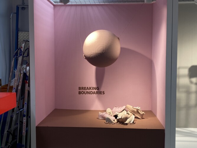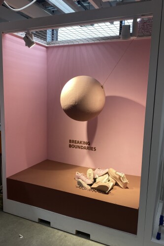 The ‘breaking boundaries’ installation was based on a colour & accessory given in our brief. I was given pink clay and men’s shoes. Through trend research I aimed the window concept at redefining masculinity. The wrecking ball is representative of the ‘typical’ masculinity and how these stereotypes can be demolished.