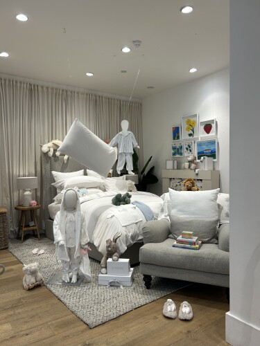 This was my major project concept used in the White Company where I did my work experience for the year. This concept was designed to be young and playful, drawing inspiration from The Little White Company kids line. The display featured a joyful scene of two children bursting into their mother’s room with toys, books, and games in hand—dressed in their seasonal summer pyjama’s, jumping on the bed, scattering pillows, and creating a lively, cheerful atmosphere. The colour scheme was aligned with the vibrant, youthful tones from the Kintentional palette, which complemented the energy of the children’s collection. Initially, the idea was to suspend a child mannequin from the ceiling to enhance the sense of motion and play.