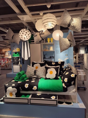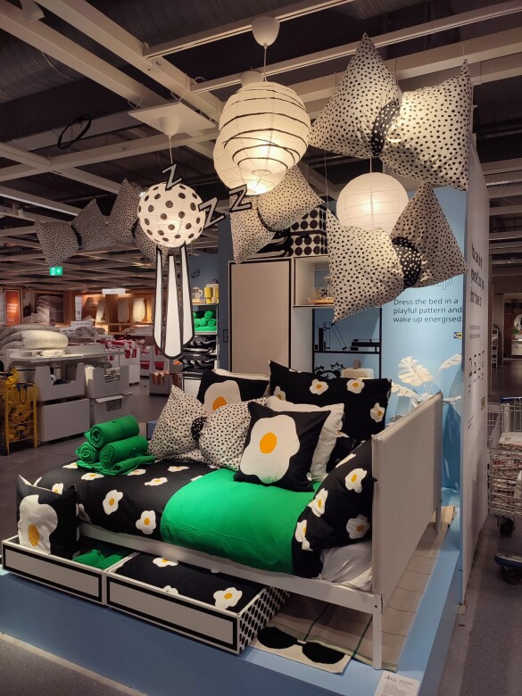 This playful interior concept blends Scandinavian modernism with pop art energy, creating a world where imagination takes center stage. Anchored by black bedding adorned with sunny-side-up eggs and paired with graphic black-and-white dots, the space feels both bold and whimsical. Clean white furniture outlined in black brings a 2D sketch effect to life, blurring the lines between drawing and reality. Walls painted in soft white and light blue, sliced through with a fresh green stripe, create a crisp and vibrant backdrop. Illustrated shelves and floating objects add a layer of surreal charm, inviting anyone to escape into a playful, uplifting universe.
