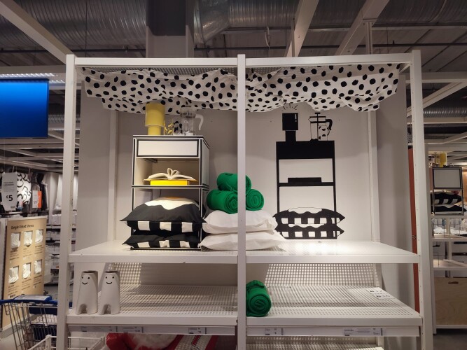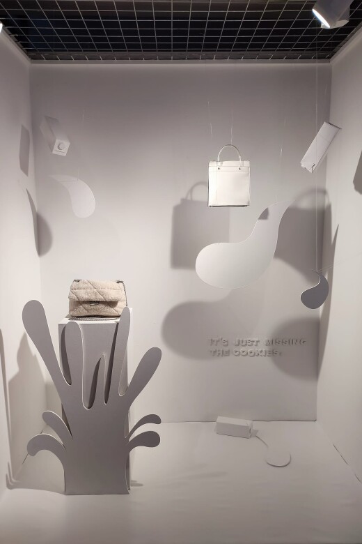 White-colored milk cartons were transformed into drops of spilled milk, adding a touch of absurdity and texture. The assigned white bags were reimagined as sculptural elements, seamlessly integrated into the composition. Shadows cast from the suspended pieces brought the display to life, proving that even in a monochromatic palette, there's room for surprise, detail, and story.